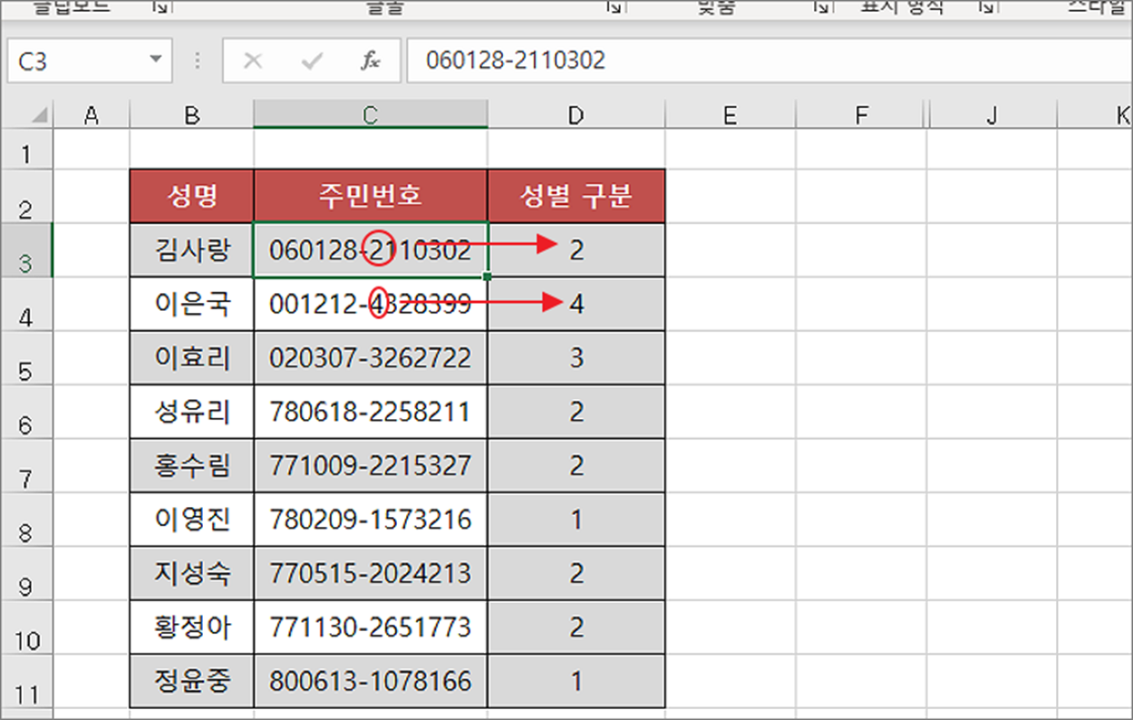 주민번호에는 성별을 구분하는 숫자가 있습니다. 전체 주민번호 데이터에서 남녀 비율이나 사람수를 남녀 별로 구분하기 위해서는 8 번째 숫자를 추출해야 합니다. 결과를 얻기 위해 사용한 함수는 IF, IFS, MID, OR 입니다. 수식 작성 방법을 설명하도록 하겠습니다.