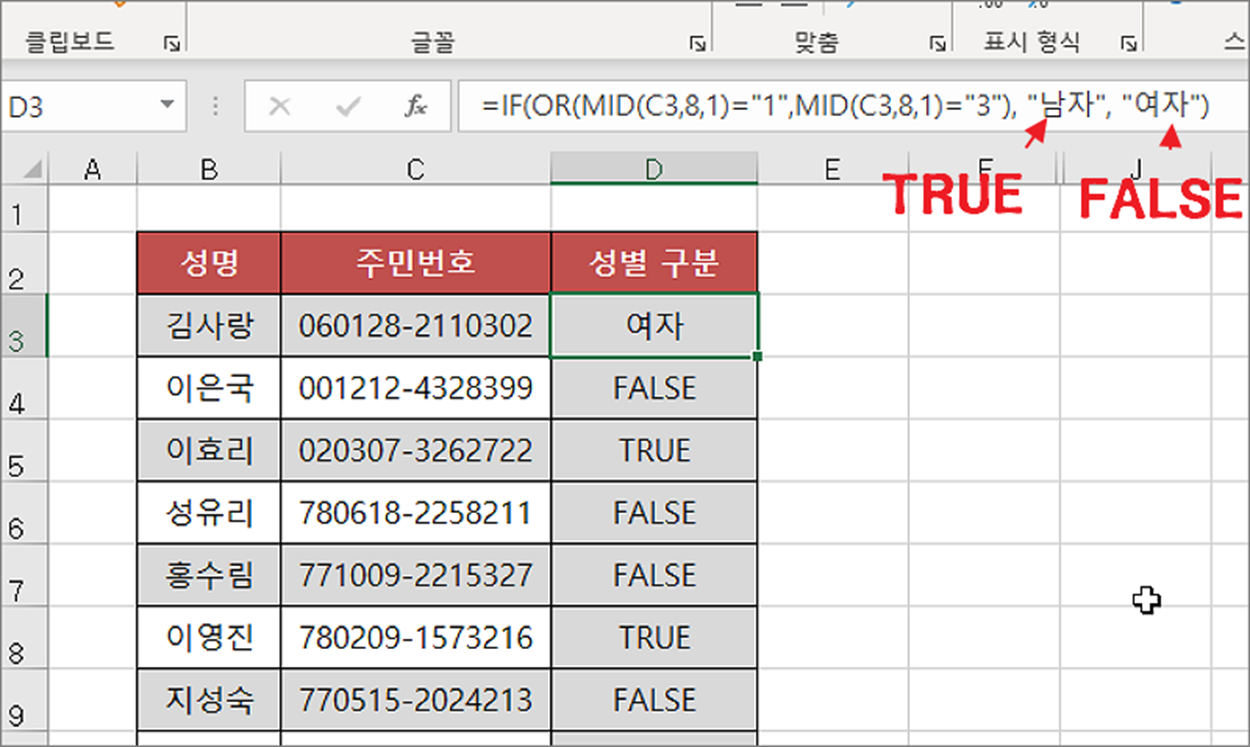 다음은 OR 과 MID 함수를 합쳐서 잘라낸 주민번호 8번째 값이 남자인지 또는 여자인지 판단해서 참/거짓으로 판단하는 수식을 만들어 보겠습니다. 주민번호에서 8번째 숫자가 1, 3 이면 남자이고 2, 4 면 여자입니다. 00 년생 이후 주민번호 생성 원리가 이전과 달라졌기 때문입니다. 00 년생 이후로는 3 이면 남자고 4는 여자입니다. 그래서 OR 함수를 이용해서 남자, 여자를 구분해야 합니다.