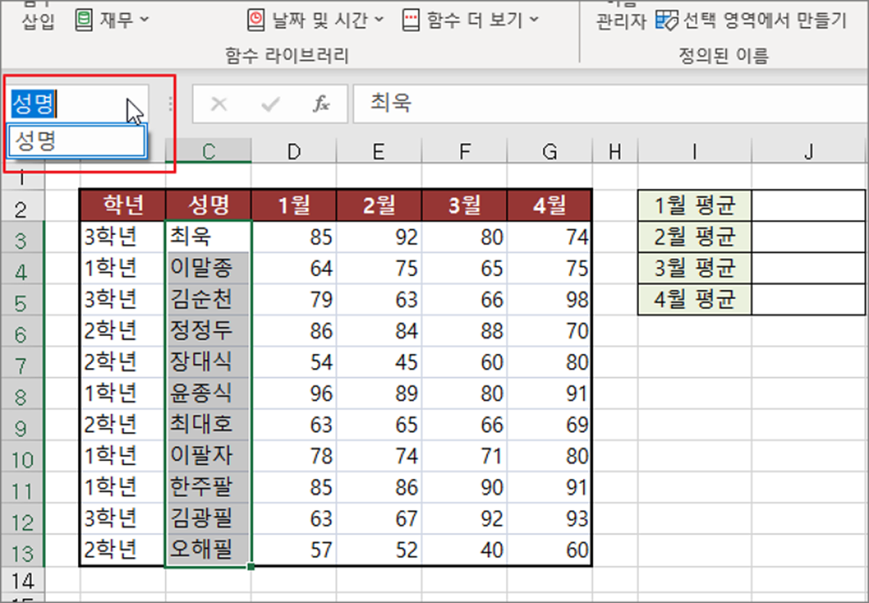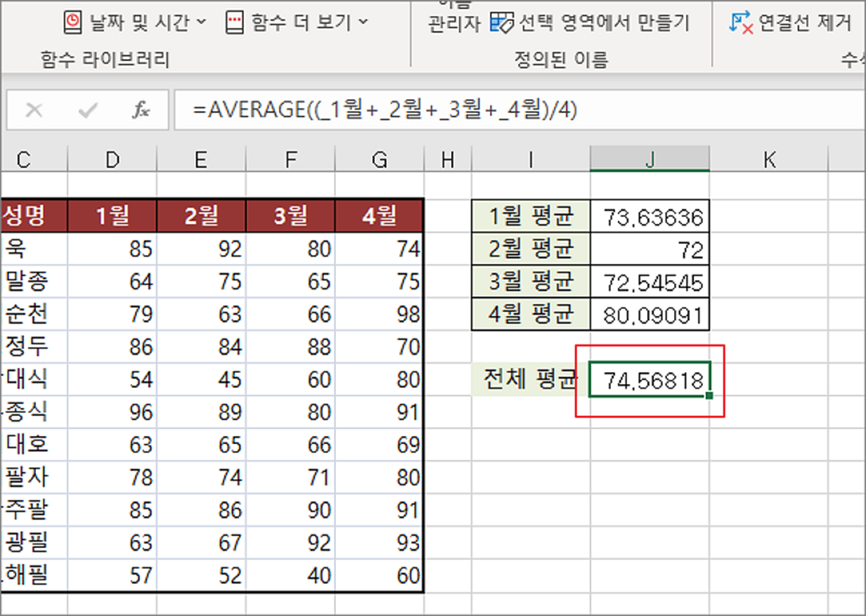 ▼ AVERAGE 함수에 셀 주소로 된 영역이 아닌 이름을 넣어서 계산을 완료했습니다.
