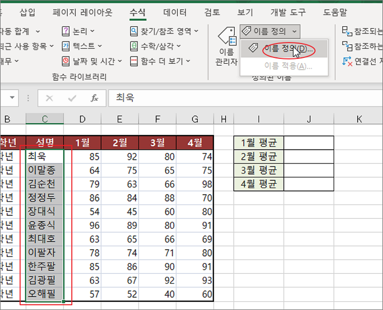 ▼ 먼저 수식에 사용할 특정 영역에 이름을 부여하겠습니다. 하나의 이름에 묶을 수 있는 영역을 선택합니다. 그리고 수식 탭 > 이름 정의 > 이름 정의 리본 메뉴를 클릭합니다.