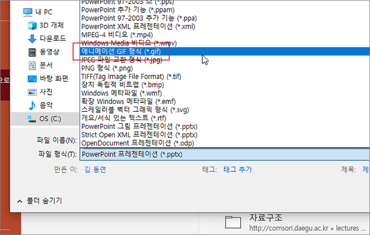 ▼ 다른 이름으로 저장 창이 뜨면 파일 형식을 GIF 로 변경하고 확인 버튼을 눌러 적당한 위치에 저장합니다.