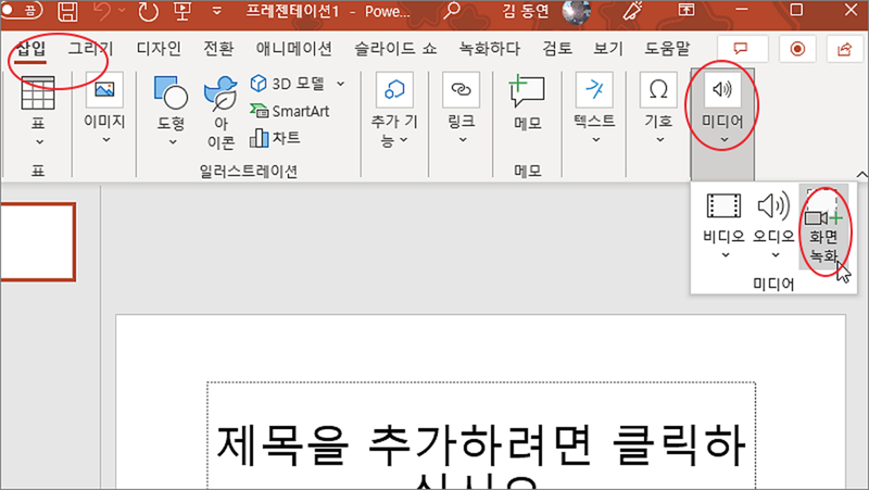 ▼ 다음은 삽입 탭 > 미디어 그룹 > 화면 녹화 리본 메뉴를 클릭합니다.