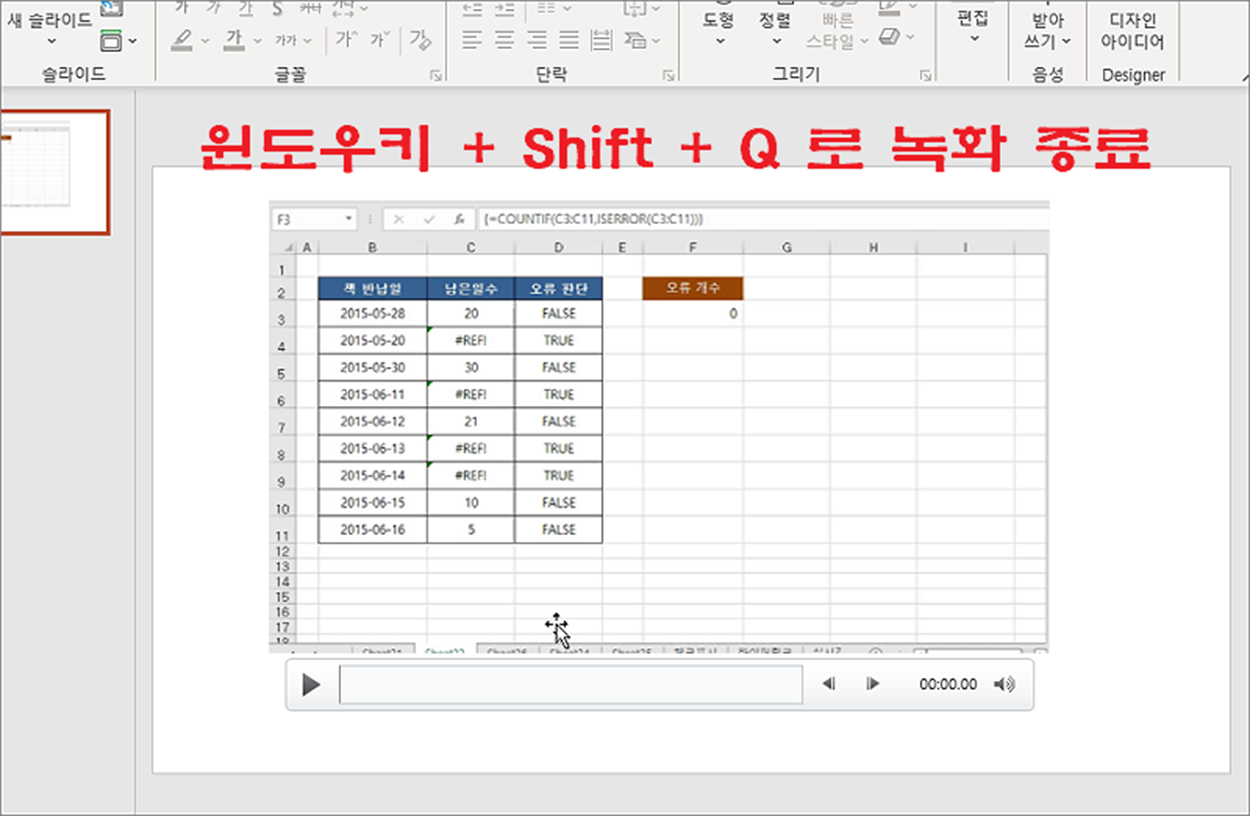 ▼ 일정 시간이 지나 녹화를 종료하고 싶다면 단축키 윈도우키 + Shift + Q 를 눌러 종료합니다. 만들어진 동영상은 파워포인트 슬라이드에 추가가 됩니다.