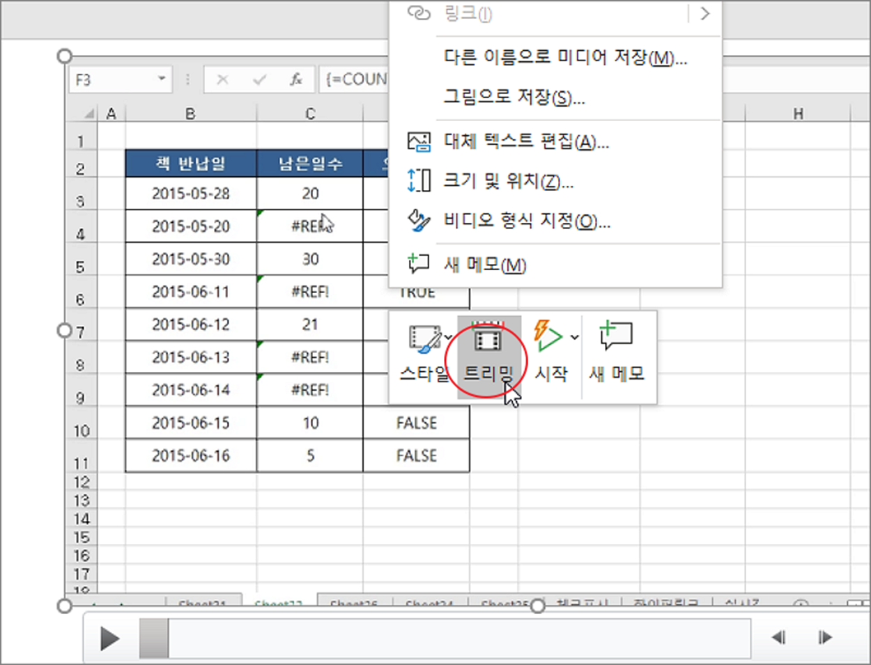 ▼ 다음은 불필요한 부분을 잘라 내기 위한 편집 작업을 진행합니다. 동영상을 선택하고 오른쪽 마우스를 눌러 빠른 실행 메뉴를 띄운 후 트리밍 클릭합니다.