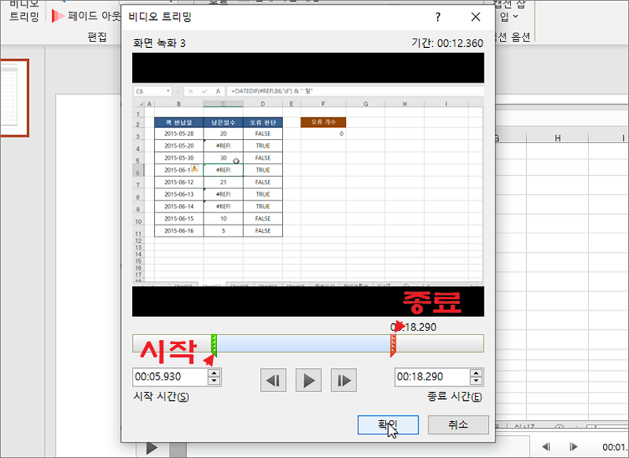 ▼ “비디오 트리밍” 창에서 불필요한 부분을 걷어 내기 위한 편집 작업을 진행합니다. 화면에서 시작과 종료 위치를 바로 조절합니다. 그리고 확인 버튼을 눌러 편집 작업을 종료합니다.