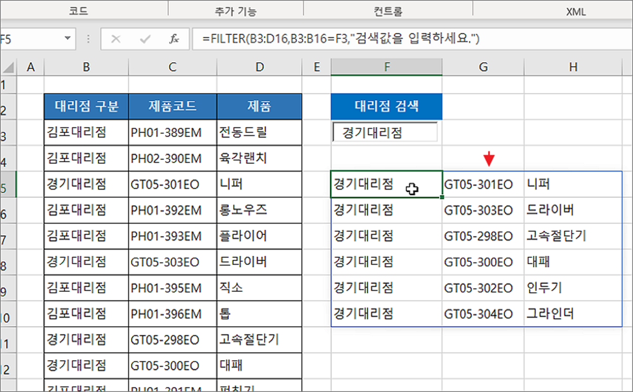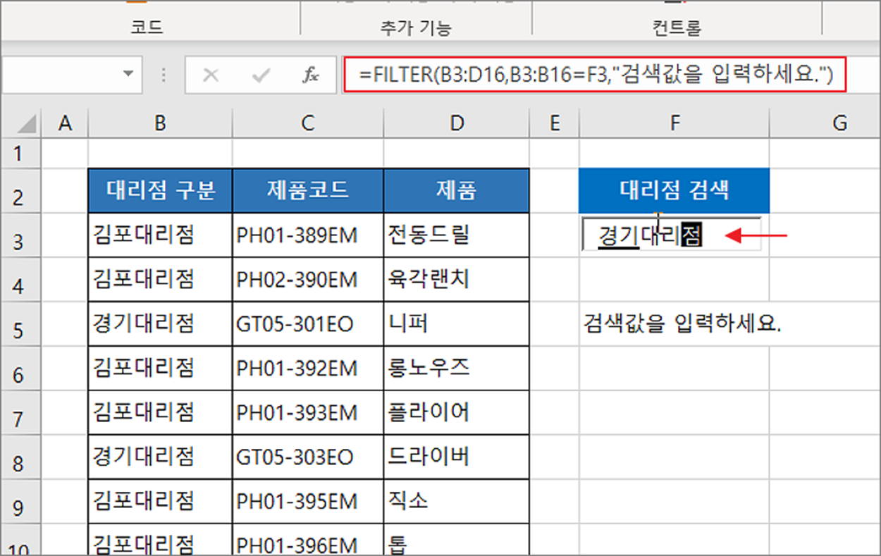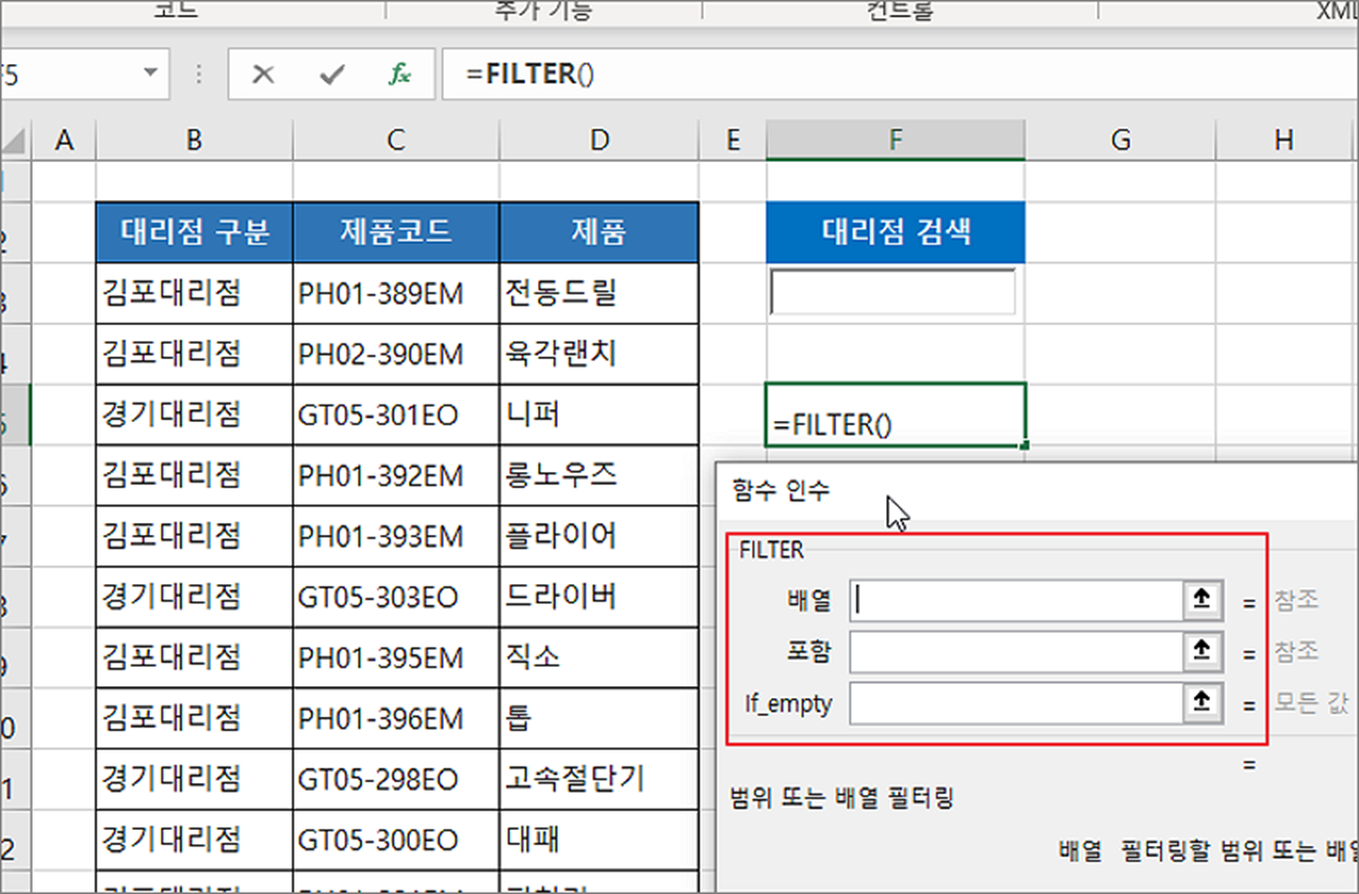▼ 사용자가 값을 입력하는 컨트롤 박스와 연계해서 결과를 가져오기 위해서는 중간에 FILTER 함수가 필요합니다. FILTER 함수는 3가지 매개변수를 가집니다.
