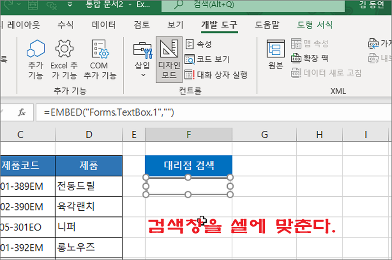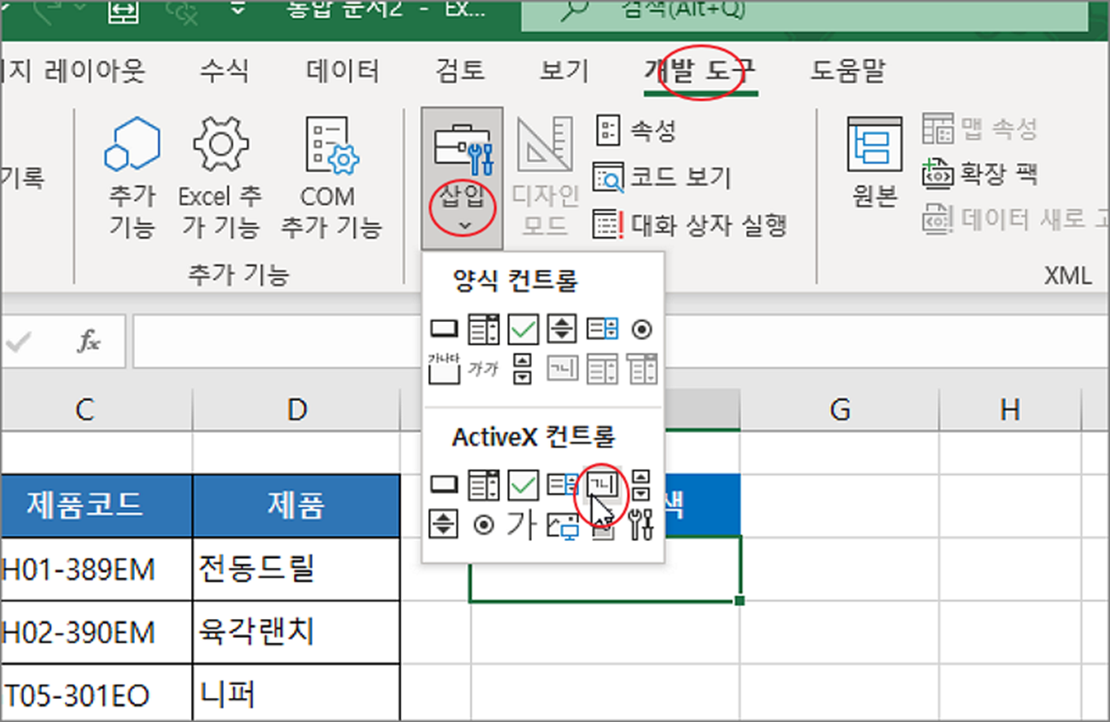▼ 이제 ActiveX 컨트롤이 있는 개발 도구가 추가되었으므로 개발 도구 > 삽입 > ActiveX 컨트롤 > 텍스트 상자를 클릭합니다. 그리고 마우스로 드래그해서 시트에 컨트롤을 추가합니다.