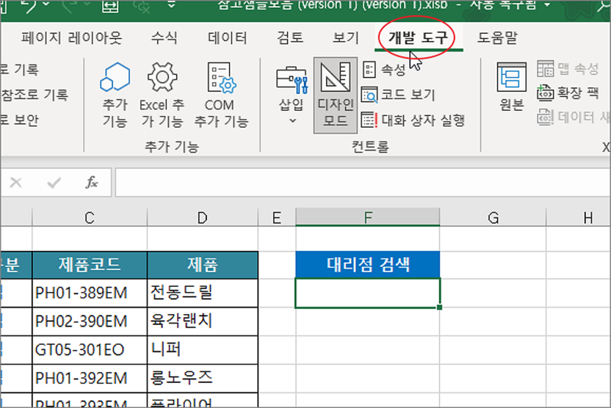 ▼ 속성 설정이 끝났다면 시트에서 사용하기 위해 디자인 모드를 해제합니다. 개발 도구 > 디자인 모드 리본 메뉴를 클릭해서 해제됩니다. 만약 속성을 변경하거나 컨트롤을 삭제하고 싶다면 다시 디자인 모드를 클릭해서 활성화 해야 합니다.