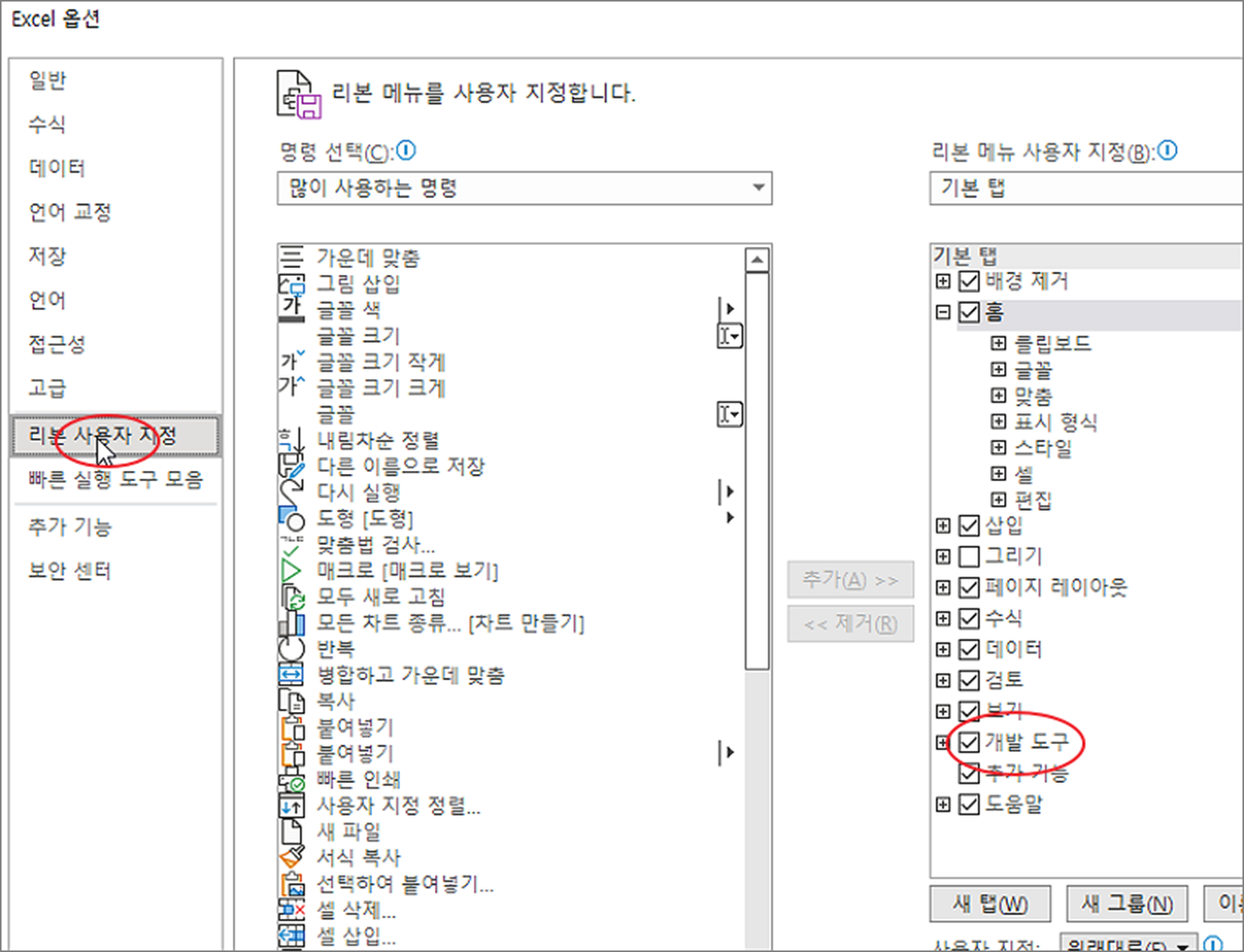 ▼ 파일 탭 > 옵션 메뉴를 클릭해서 Excel 옵션창을 띄웁니다. 다음 왼쪽 메뉴 리스트에서 리본 사용자 지정을 선택합니다. 오른쪽 화면으로 이동해서 개발 도구 가 체크되어 있는지 확인합니다.
