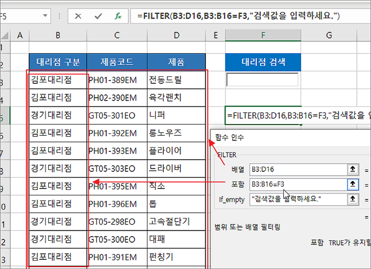 ▼ “배열” 에는 검색해서 찾고 싶은 영역 전체를 지정합니다. 두 번째 필드인 “포함” 은 검색 대상이 있는 영역을 말합니다. 범위에서 검색값이 있는 셀과 동일한 데이터를 찾아야 하므로 같음을 의미하는 “=” 로 “B3:B16=F3” 처럼 식을 만듭니다. F3 는 텍스트 상자에서 LinkedCell 항목에 입력한 셀 주소를 말합니다. 텍스트 상자에 입력한 값은 F3 에 출력이 되기 때문입니다. 마지막 If_empty 는 필수 입력조건은 아닙니다. FILTER 함수를 수행하고 결과값이 없는 경우 출력할 텍스트를 입력합니다.