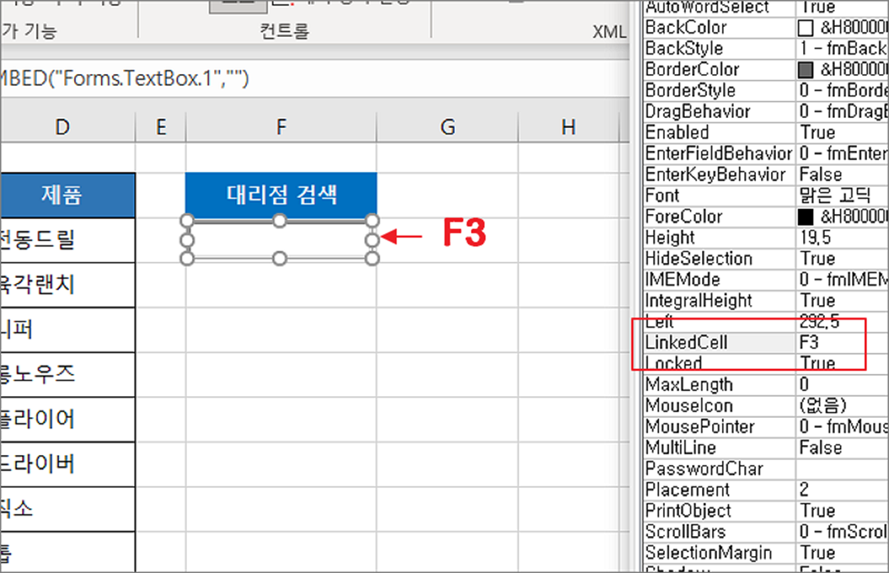 ▼ 속성창에서 LinkedCell 항목을 찾아 텍스트상자와 연결할 셀을 지정합니다. 저는 텍스트상자가 있는 위치의 F3 를 입력했습니다. 이제 검색상자에 입력한 값은 지정한 셀에 나타납니다. 아래 샘플처럼 검색상자가 셀을 가린다면 보이지는 않겠죠.