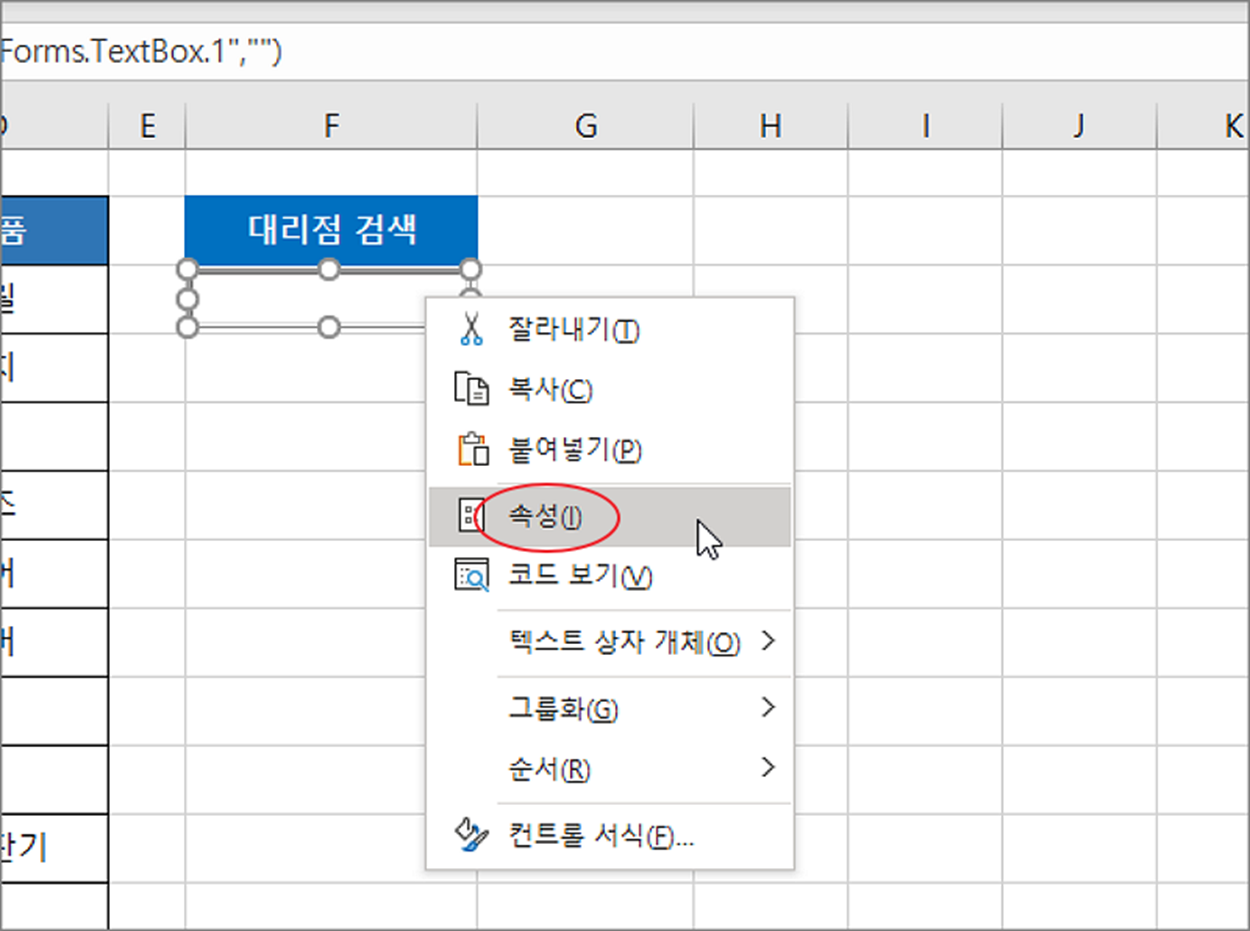 ▼ 다음은 텍스트상자에 입력한 값을 특정 셀과 연결하기 위한 세팅을 해야 합니다. 컨트롤을 선택하고 오른쪽 마우스를 누릅니다. 빠른 실행 메뉴가 뜨면 속성 메뉴를 선택합니다.