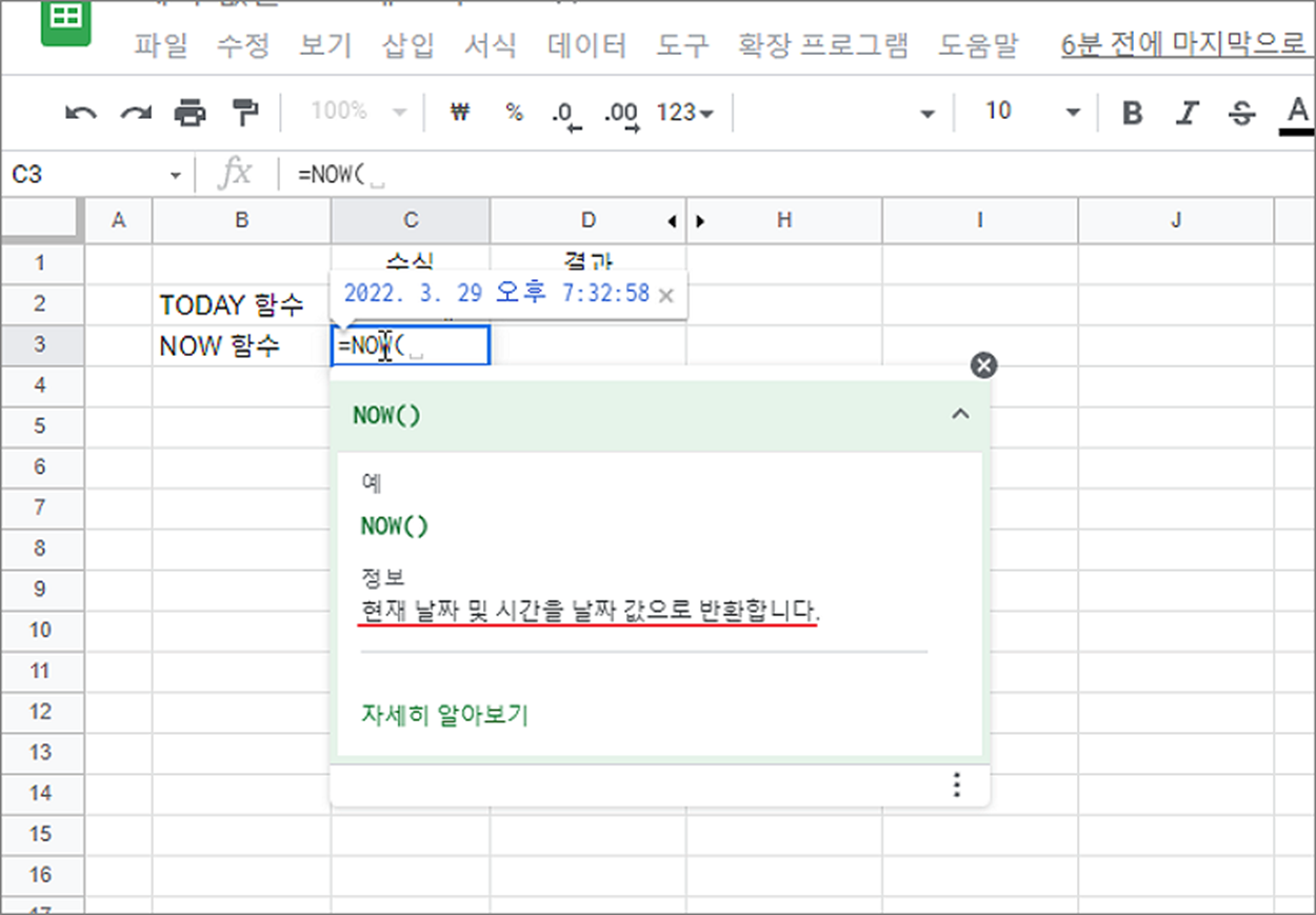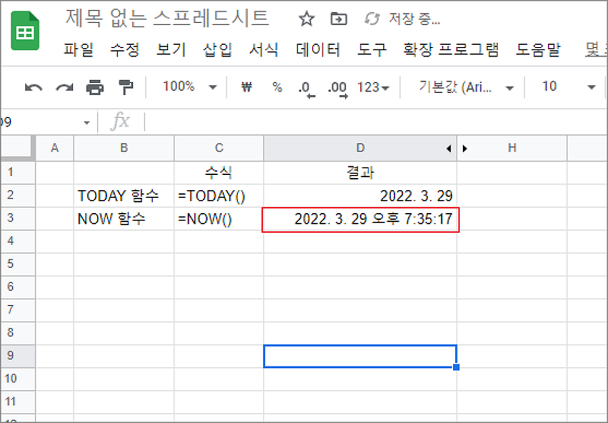 ▼ NOW 함수 사용결과 현재 시간과 날짜를 표시하고 있습니다.