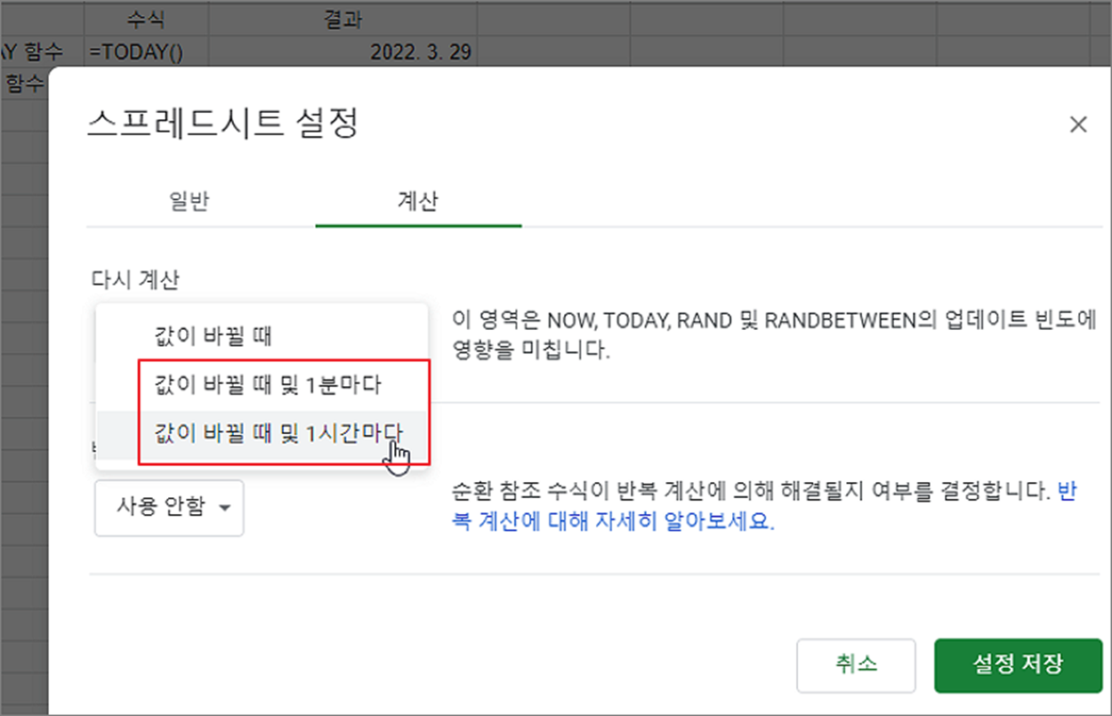 ▼ 만약 시간 업데이트 빈도수를 값 변경이 아닌 1분마다 적용하고 싶다면 파일 > 설정 메뉴를 선택해서 스프레드시트 설정창을 띄웁니다.