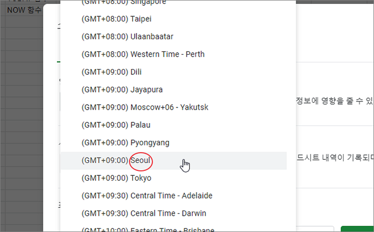 ▼ 날짜와 시간의 변경 시간대를 맞추고 싶다면 파일 > 설정 메뉴를 클릭합니다. 스프레드시트 설정에서 일반 탭으로 이동한 뒤 시간대 목록에서 주요 도시를 변경합니다.