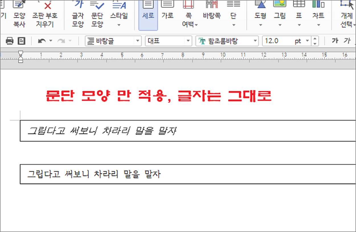 ▼ 이전과 달리 모양복사 창이 뜨지 않고 위에서 복사한 문단 모양과 동일하게 적용된 것을 확인할 수 있습니다. 문단 모양만 복사해서 적용했기 때문에 글자 모양에는 변화가 없습니다.