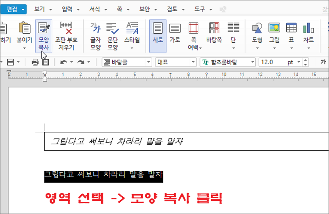▼ 문서에서 적용하고 싶은 영역을 드래그해서 선택합니다. 그리고 오른쪽 마우스를 눌러 편집 탭 > 모양복사 리본 메뉴를 클릭합니다.