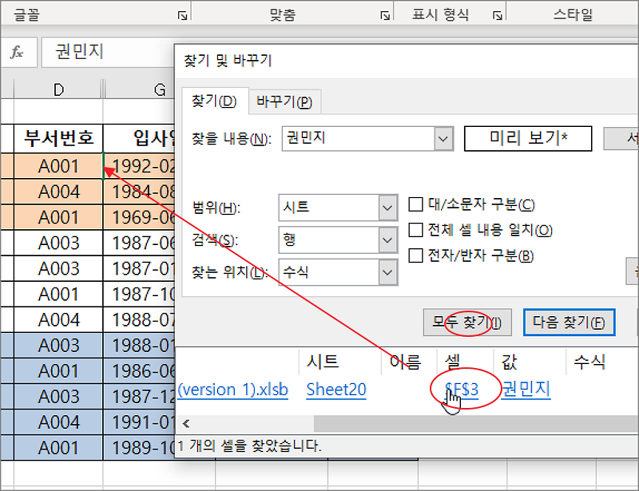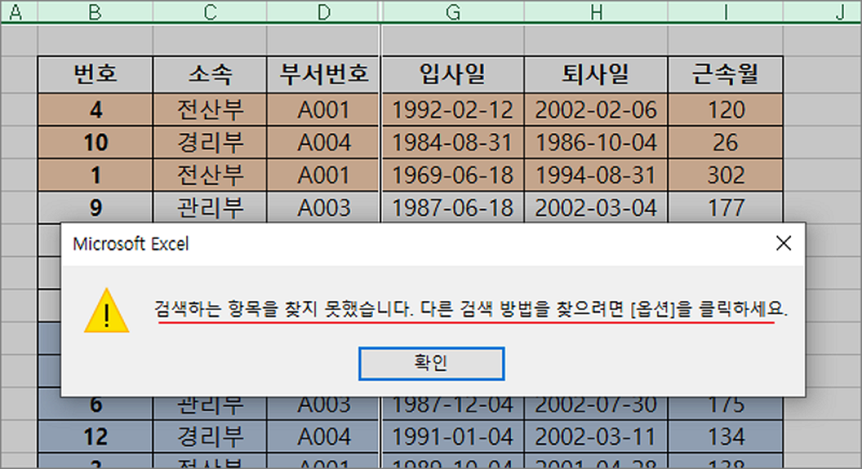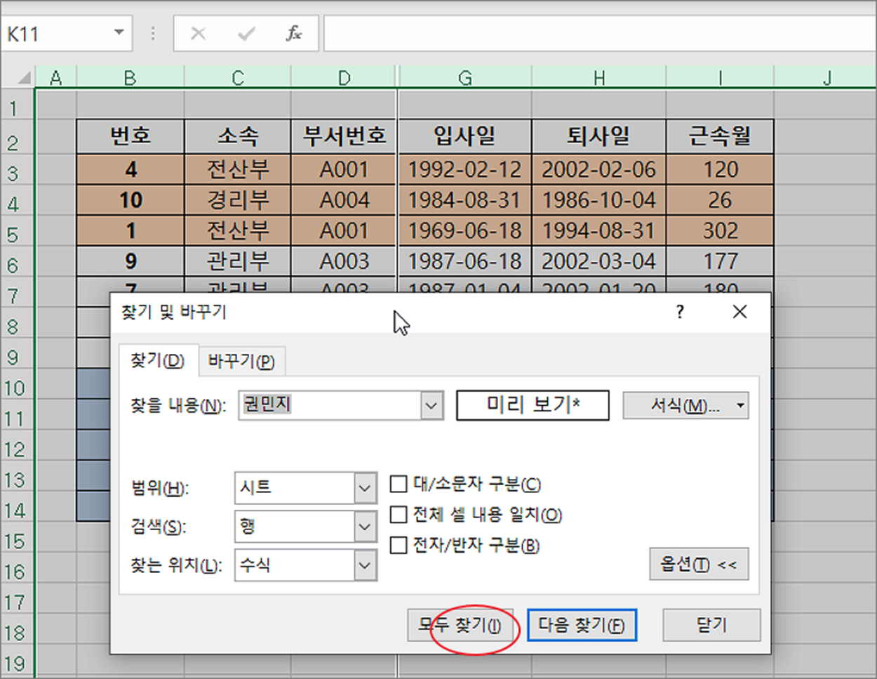 ▼ 찾은 데이터는 숨기기 열에 있기 때문에 보이지는 않습니다. 하지만 검색은 성공한 것입니다. 다음 찾기 옆에 모두 찾기 버튼을 눌러 보세요. 한 번에 모두 찾아서 목록에 표시합니다. 여기에서 숨기기로 보이지 않은 데이터까지 모두 찾을 수 있습니다.