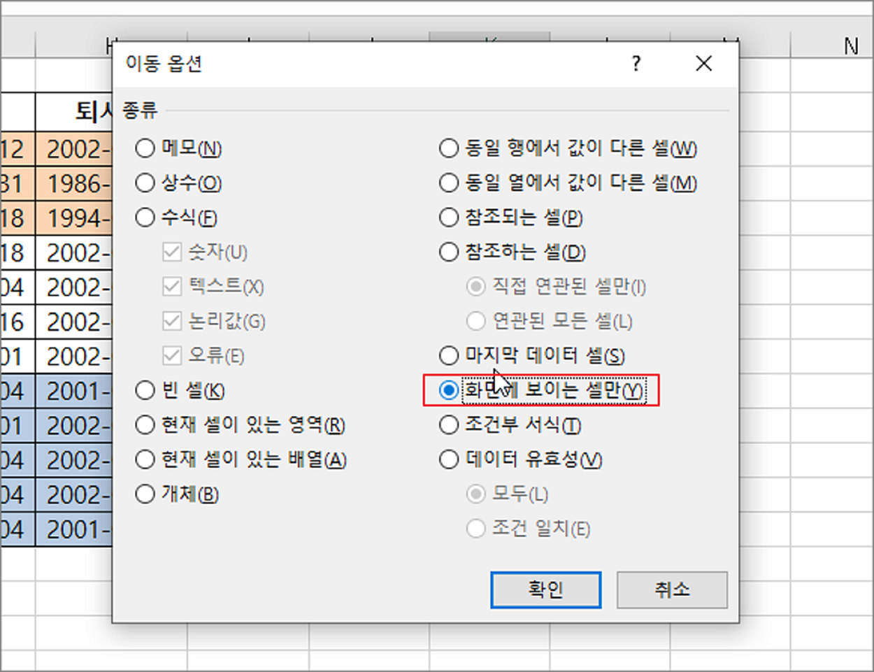 ▼ 이동 옵션에서 화면에 보이는 셀만 을 선택하고 확인 버튼을 누릅니다.