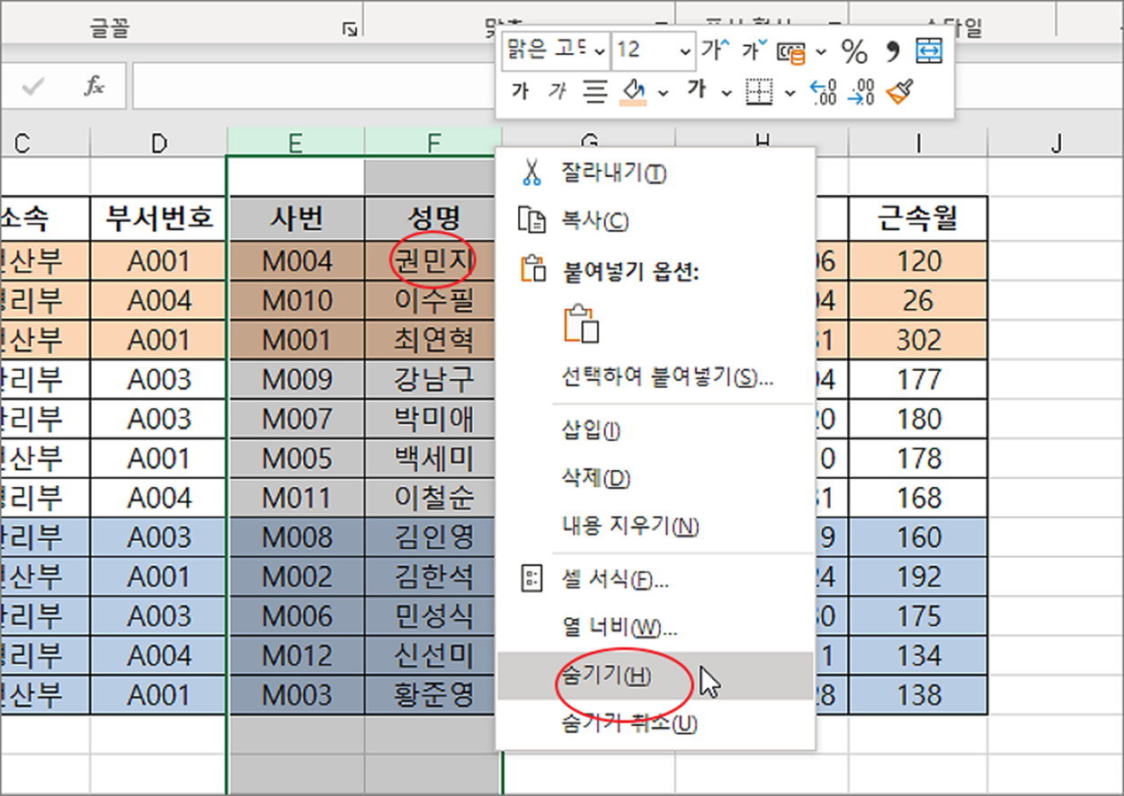 ▼ 먼저 테스트를 위해 특정 열을 숨겨보겠습니다. 검색할 데이터가 포함된 열을 선택하고 오른쪽 마우스를 누른 후 숨기기를 클릭합니다. 검색할 데이터는 “권민지” 입니다.