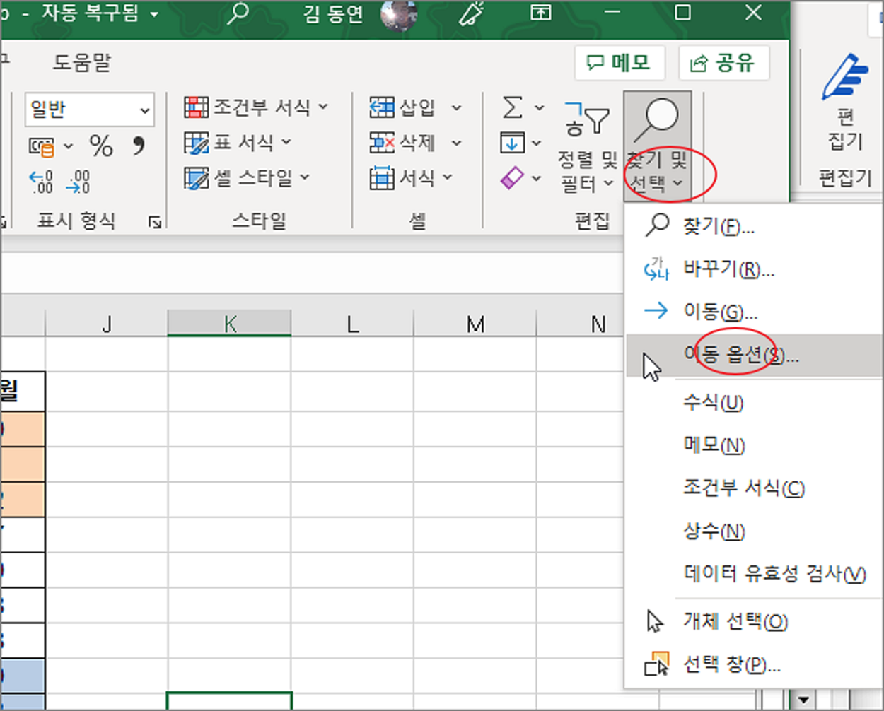 ▼ 지금까지 숨기기를 한 데이터도 검색이 된다는 것을 확인했습니다. 이제는 제외하고 검색하는 방법을 알아보겠습니다. 먼저 설정할 것이 있습니다. 홈 탭 > 찾기 및 선택 > 이동 옵션 메뉴를 선택합니다.