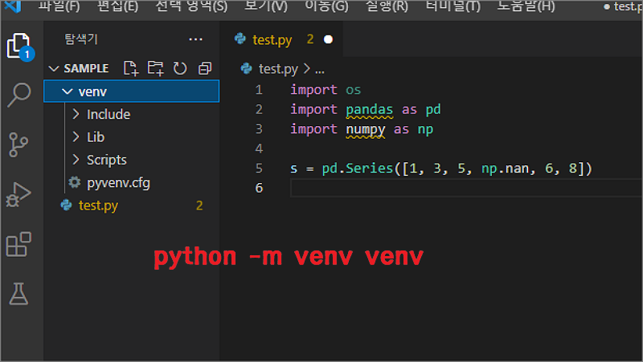 ▼ 편집기 하단에 생성된 터미널 탭으로 이동합니다. 그리고 명령줄에 “python -m venv venv” 를 입력합니다. 다음 명령어 “python -m venv” 뒤에는 사용자가 원하는 가상 환경 이름을 입력합니다.