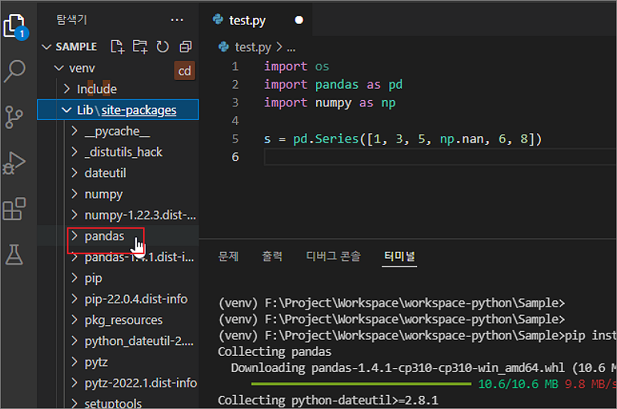 ▼ 가상 환경이 활성화된 상태에서 pip 을 이용해 라이브러리를 다운받습니다.