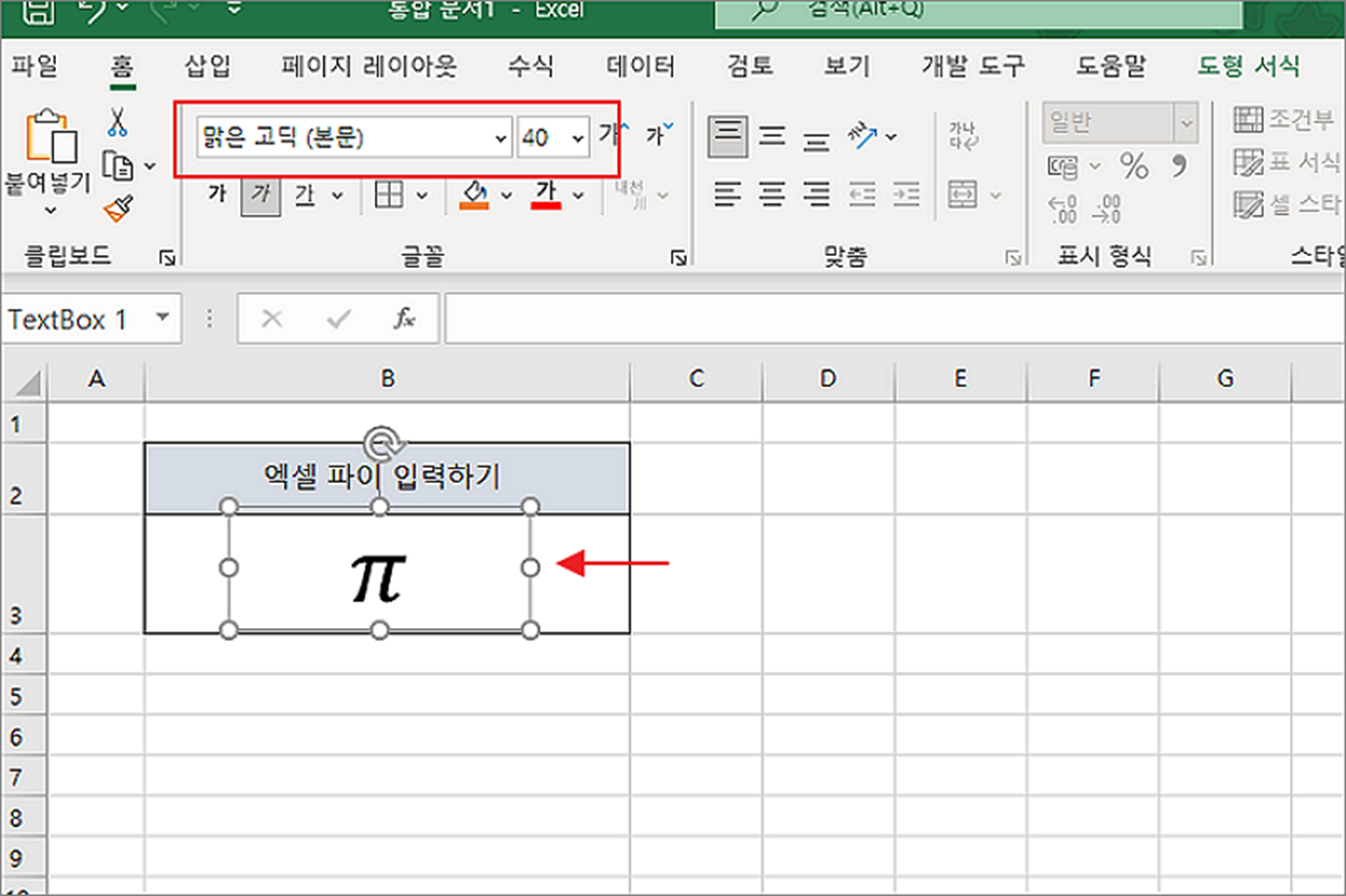 ▼ 파이 기호를 입력했습니다. 글자가 작아 보인다면 홈 탭에서 글꼴을 조절합니다.