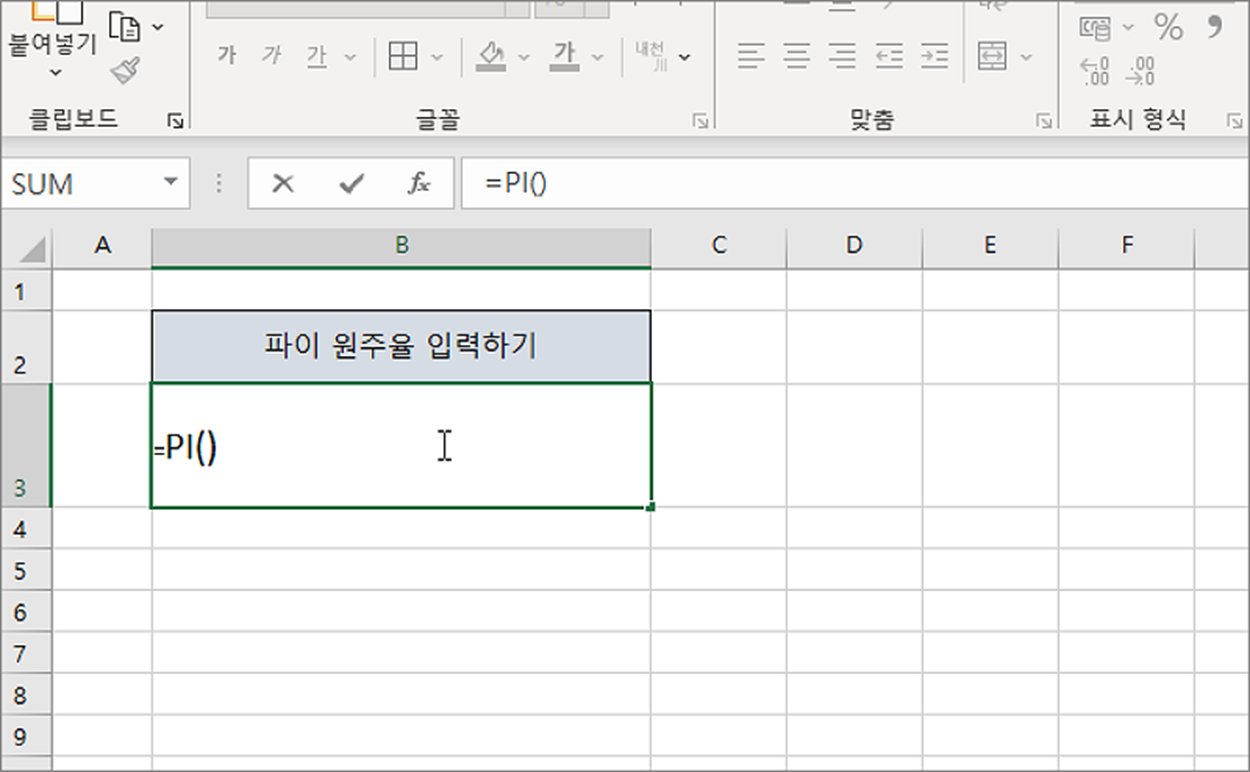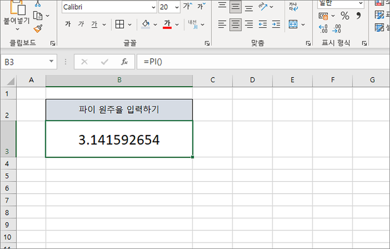 ▼ 함수를 입력하고 Enter 를 누르면 원주율을 셀에 표시합니다.