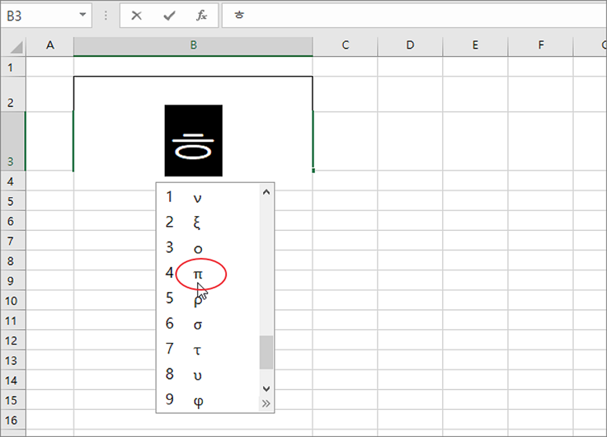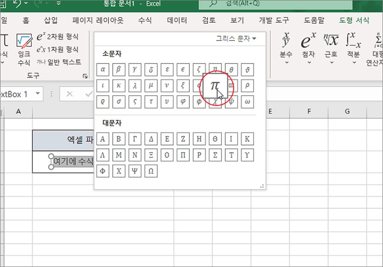 ▼ 그리스어 및 콥트어 목록에서 파이를 찾아 선택하고 아래에 삽입 버튼을 누르면 셀에 추가가 됩니다.