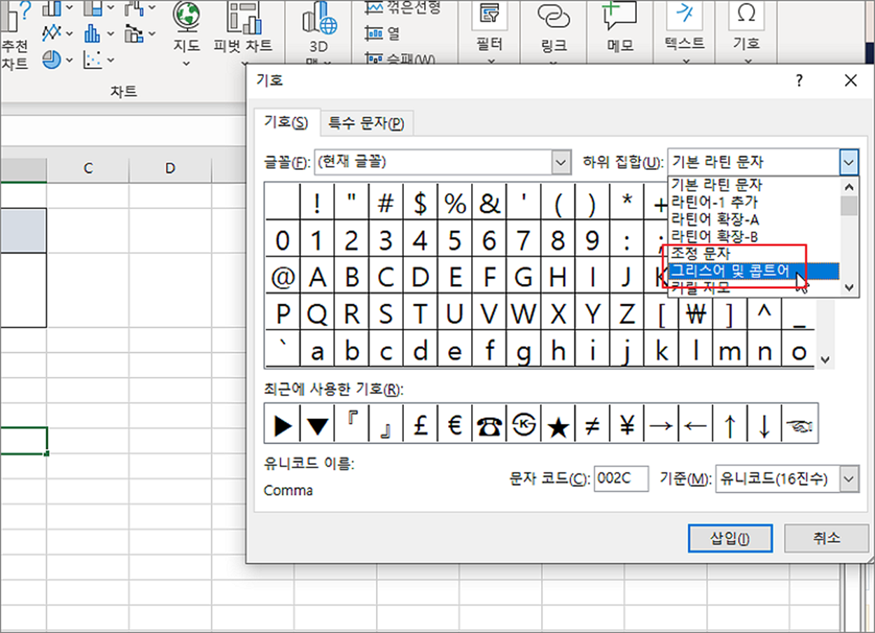▼ 기호 입력창에서 하위 집단을 그리스어 및 콥트어로 선택합니다. 기호가 너무 많아서 좀 더 빠르게 찾기 위한 선택입니다.