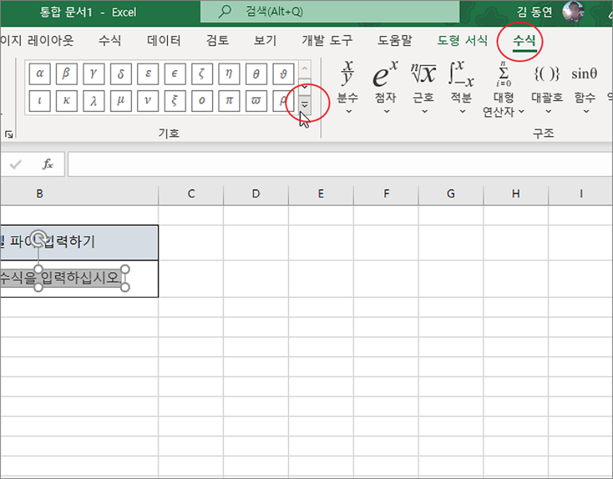 ▼ 첫 번째로 수식 입력창을 이용해서 입력해 보겠습니다. 삽입 탭 > 기호 그룹 > 수식 리본 메뉴를 클릭합니다.
