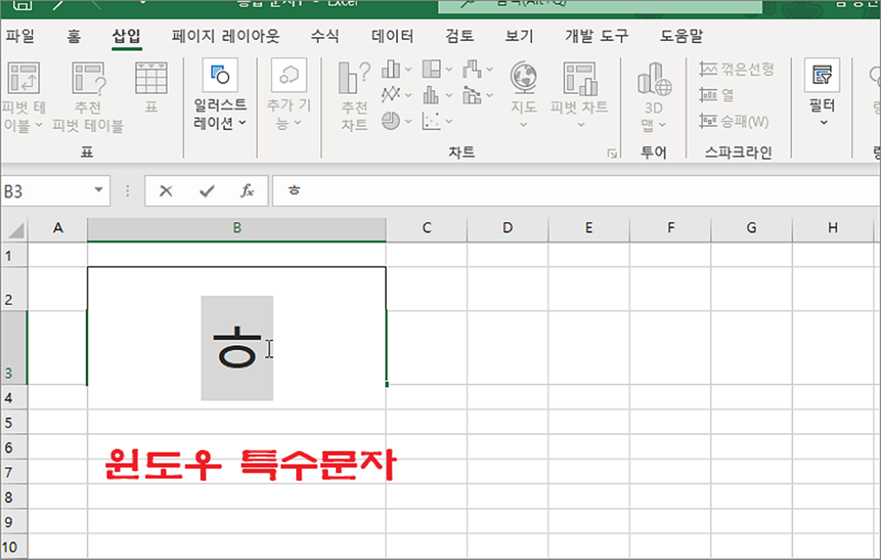 ▼ 마지막 세 번째는 윈도우에서 지원하는 특수문자를 이용하는 방법입니다. 셀에 한글 자음인 “ㅎ” 을 입력합니다.