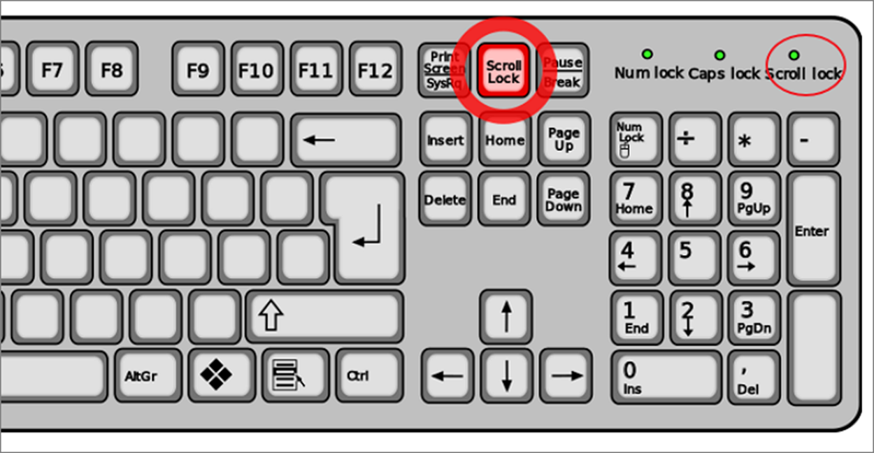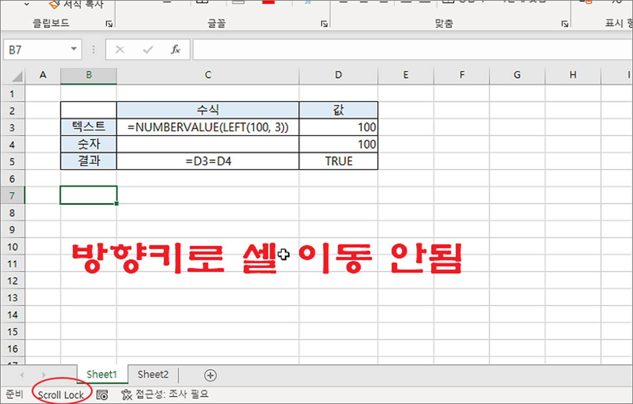 ▼ 만약 방향키를 눌렀는데 셀 이동이 안된다면 키보드에서 Scroll Lock 키를 눌렀기 때문입니다. Scroll Lock 에 불이 들어와 있다면 해당 기능이 켜져 있는 것입니다.