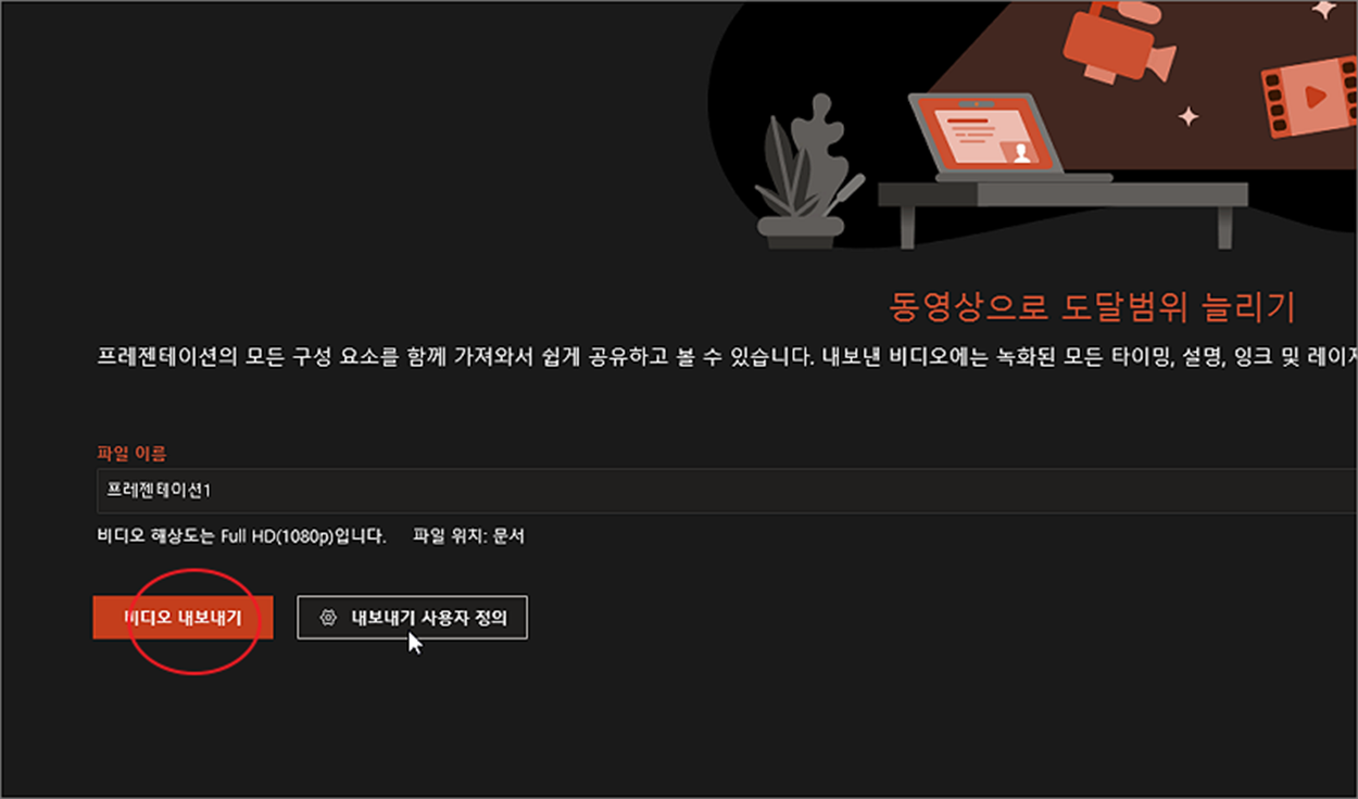 ▼ 다음 화면에서 저장할 위치를 지정하고 “비디오 내보내기” 버튼을 클릭합니다.