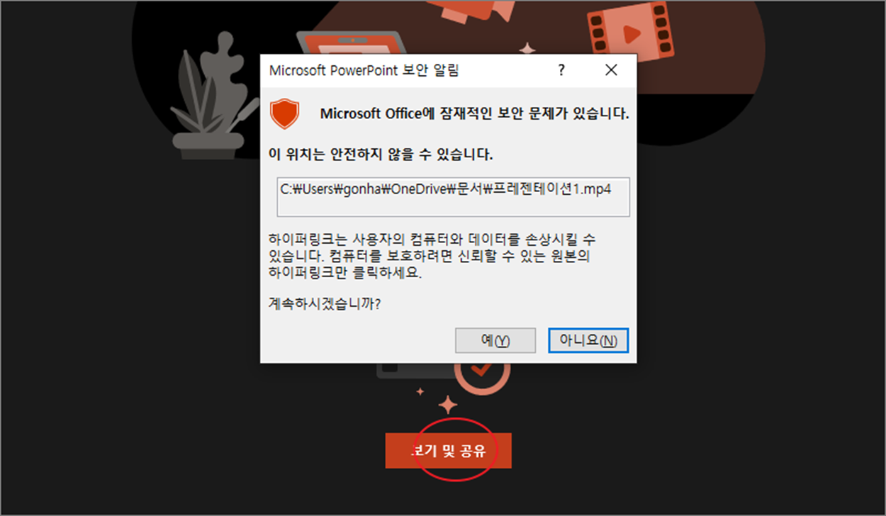 ▼ 연결된 동영상을 실행할 것인지 묻는 창에서 “예” 를 누르면 윈도우에 깔려 있는 동영상 툴로 실행합니다.