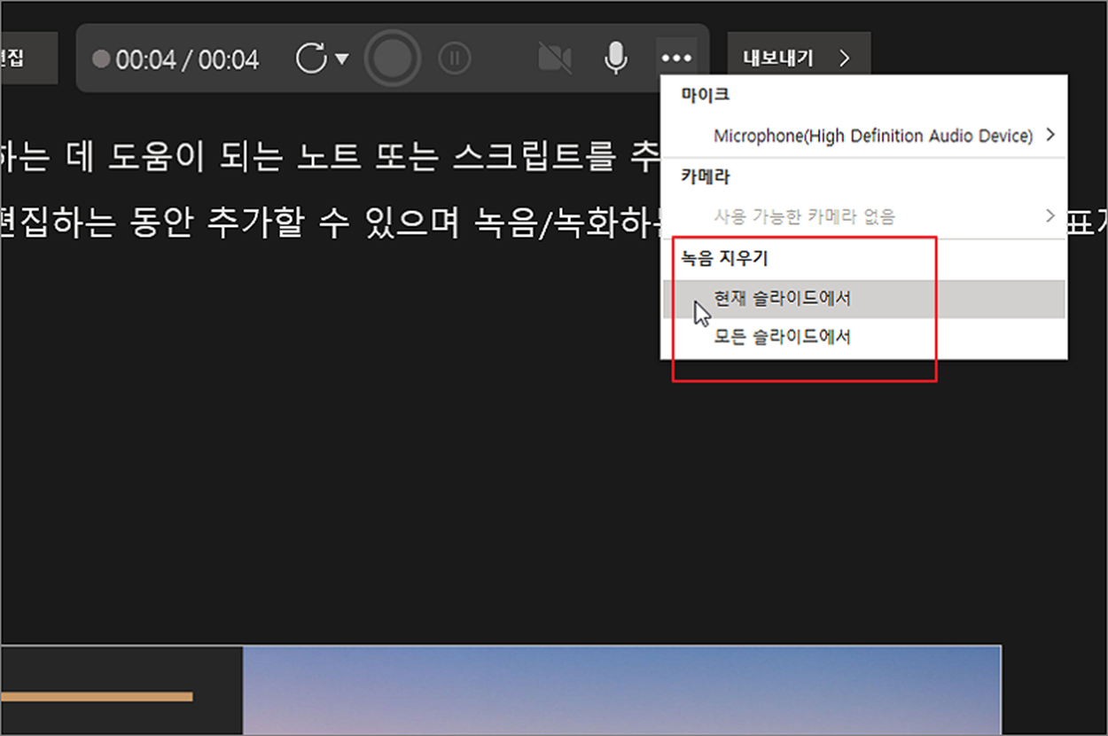 ▼ 제작한 동영상의 녹음도 바로 지울 수 있습니다. 툴바 끝으로 가서 더보기 > 녹음 지우기 > 현재 슬라이드에서, 모든 슬라이드에서 메뉴를 클릭합니다.