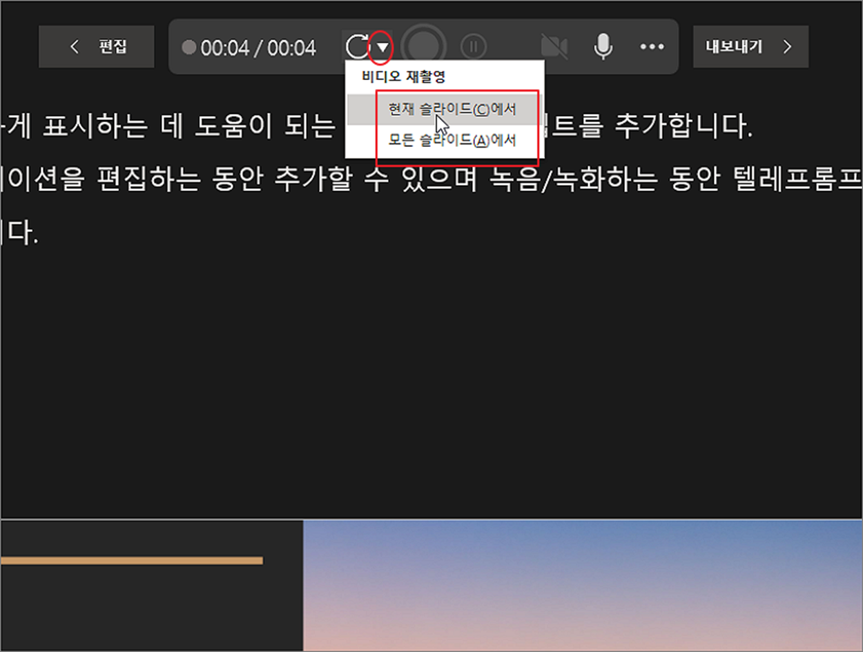 ▼ 동영상을 다시 재작하고 싶다면 화살표 버튼을 눌러 “현재 슬라이드에서” 혹은 “모든 슬라이드에서” 중 하나를 선택합니다.