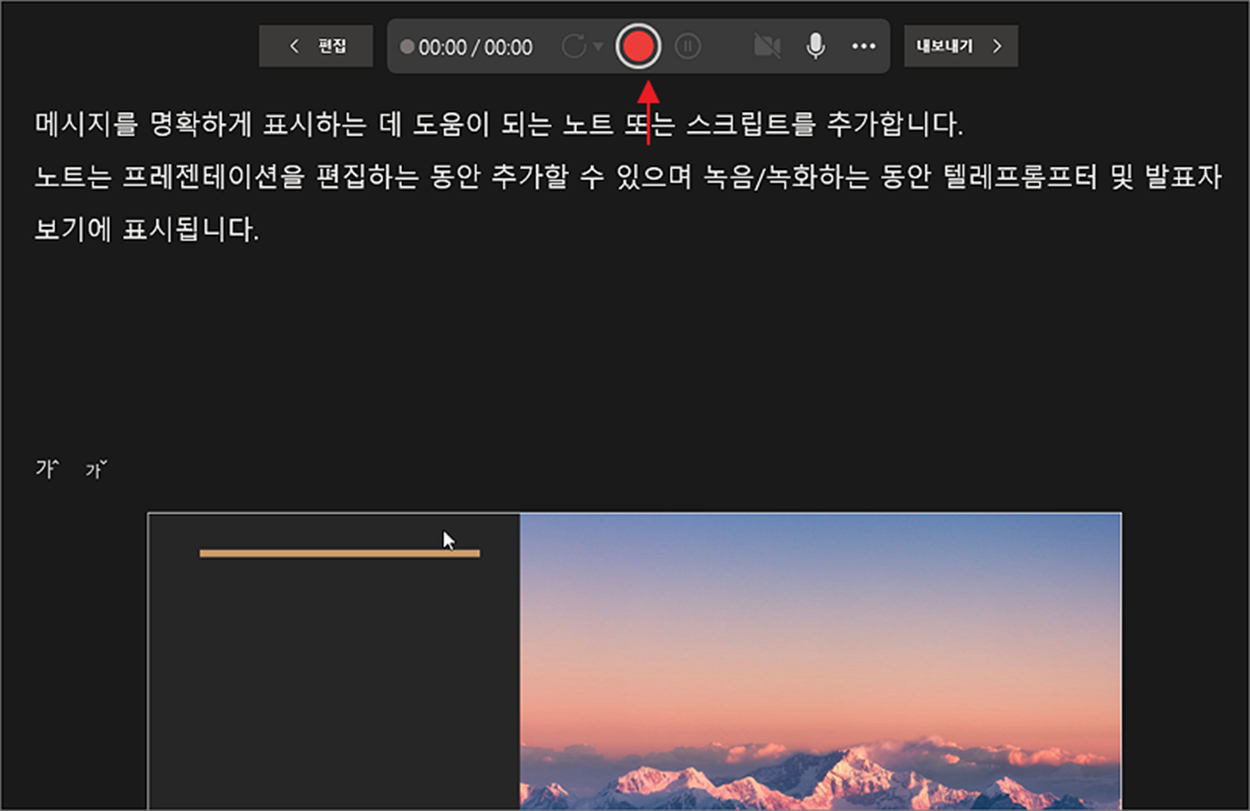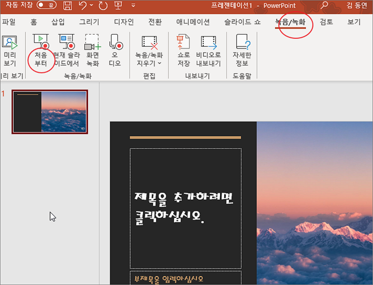 ▼ 슬라이드 쇼를 하면서 바로 녹화가 가능한 녹음/녹화 탭으로 이동합니다. 슬라이드 쇼 실행을 위해 “처음부터” 혹은 “현재 슬라이드에서” 를 클릭합니다.