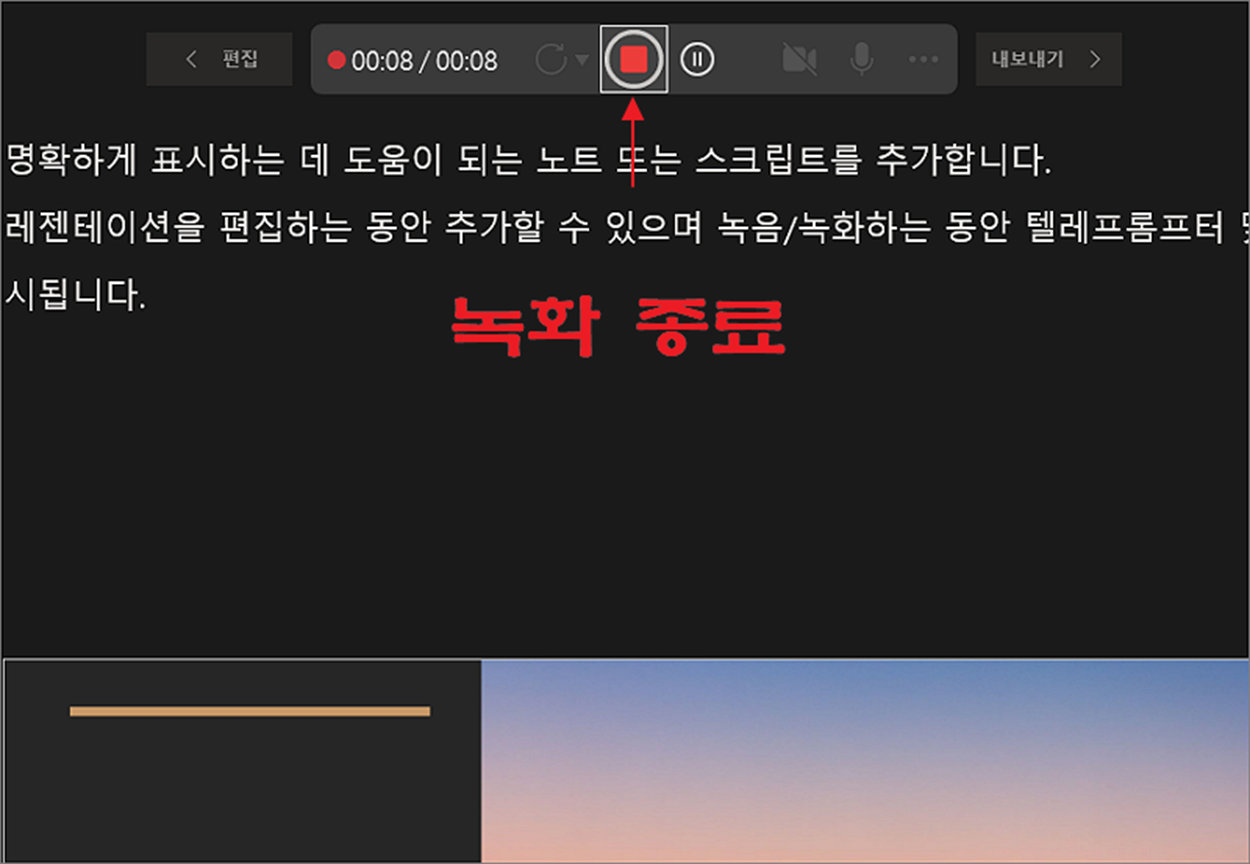 ▼ 슬라이드 쇼가 끝나고 녹화를 종료하기 위해 상단 툴바에서 정지 버튼을 클릭합니다.