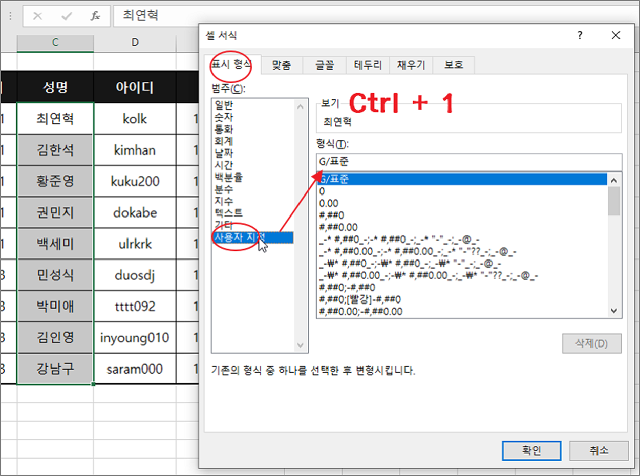 ▼ 다음 Ctrl + 1 단축키를 눌러 셀 서식 창을 띄웁니다. 셀 서식의 표시 형식 탭으로 이동한 뒤 범주에서 사용자 지정을 선택합니다.