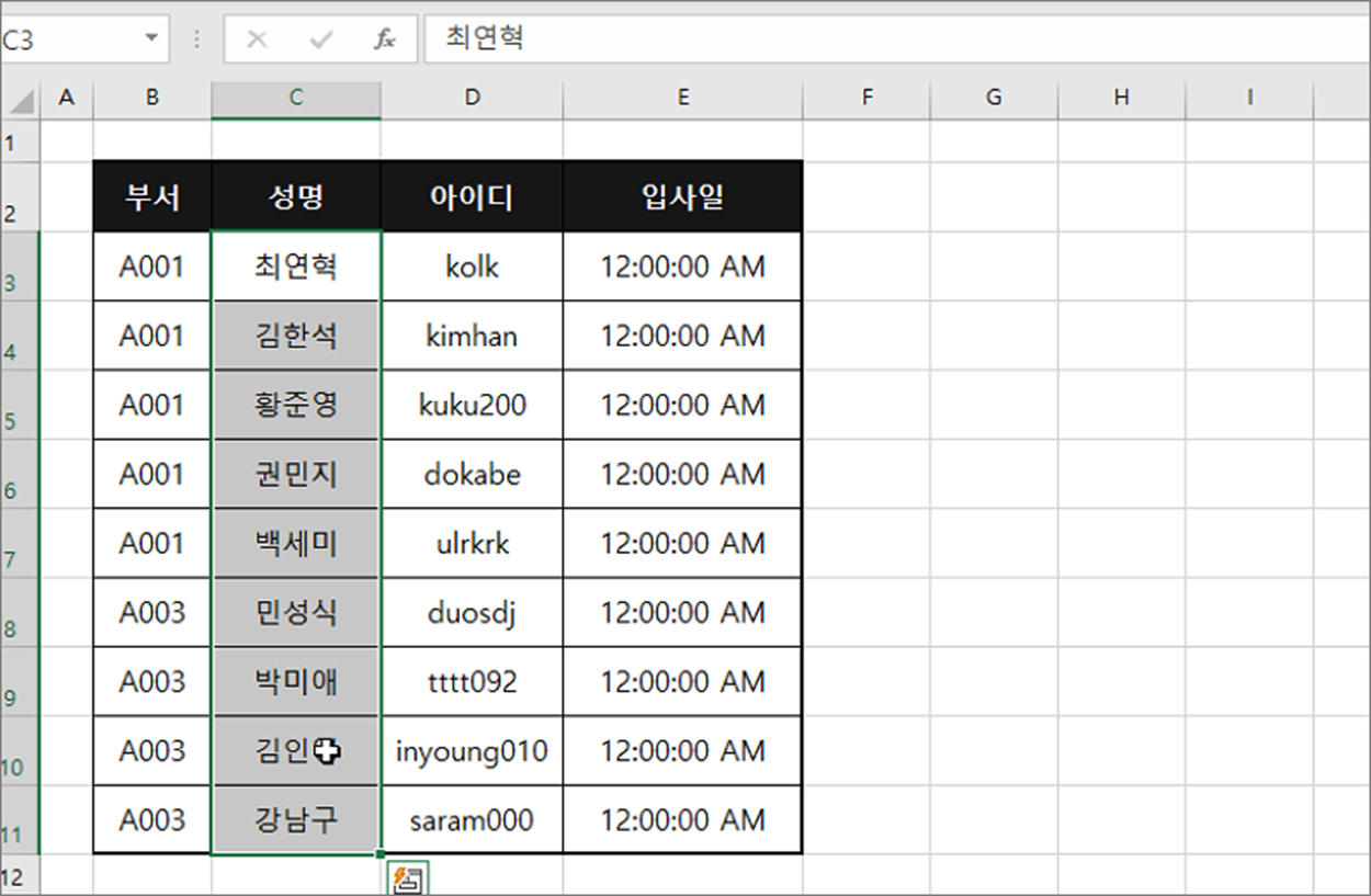 ▼ 먼저 동일한 텍스트를 추가해야 하는 셀을 선택합니다.