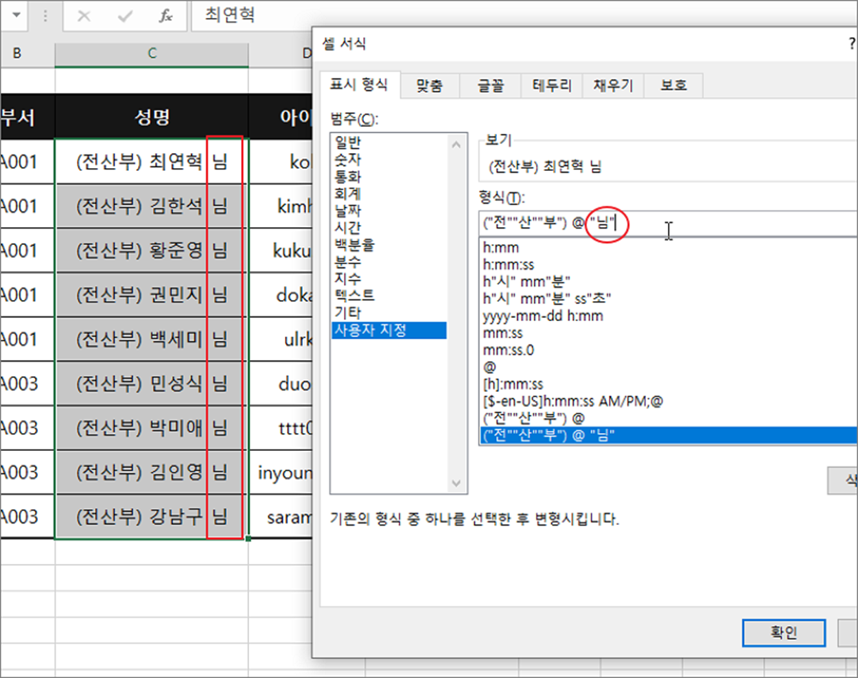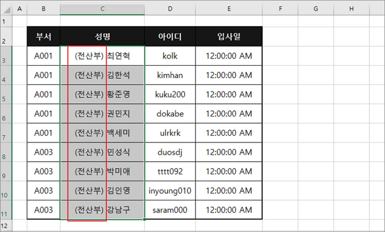 ▼ 결과는 다음과 같습니다. @ 앞에 입력한 “(전산부)” 가 일괄적으로 추가가 되었습니다.
