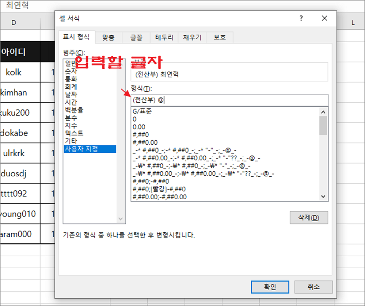 ▼ 글 뒤에도 동일하게 넣어야 하는 텍스트를 추가해 보겠습니다. 방법은 동일합니다. 셀 서식 창을 열고 @ 다음에 원하는 텍스트를 입력합니다.