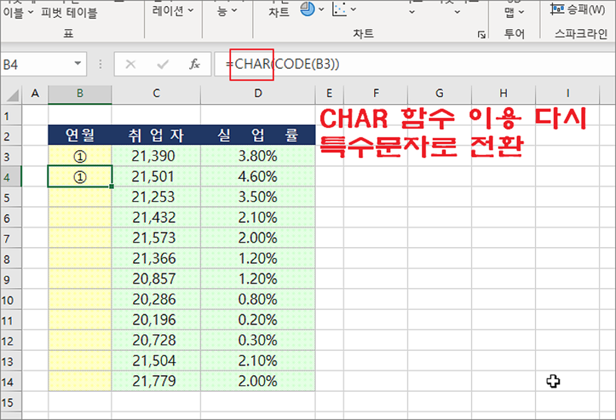 ▼ CODE 로 구한 원문자 1 에 해당하는 숫자는 다시 CHAR 함수를 이용해서 이전 특수문자로 변환할 수 있습니다.