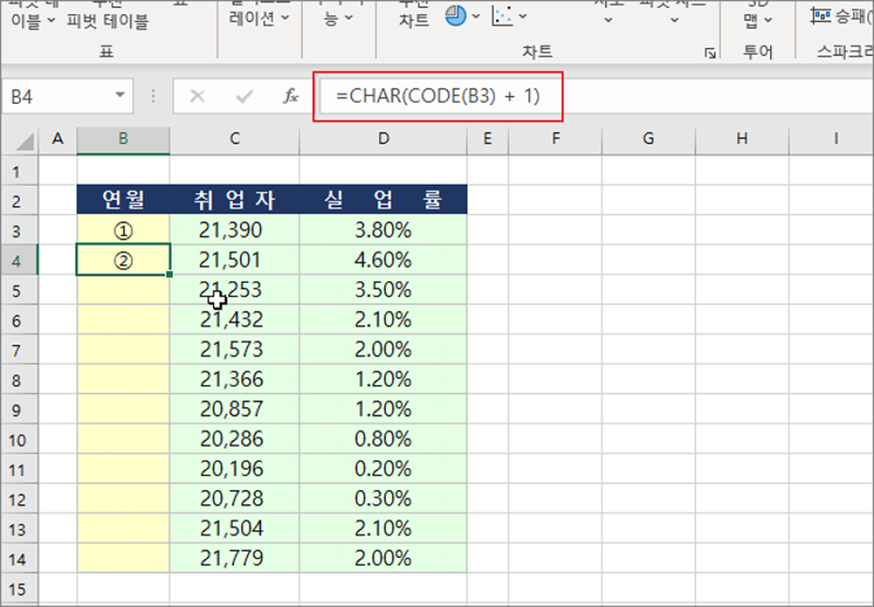 ▼ 엑셀 자동 채우기 기능을 이용하면 수식에서 CODE 에 1씩 증가시킬 수 있습니다. 아래 그림처럼 드래그만으로 원문자를 자동으로 추가했습니다.