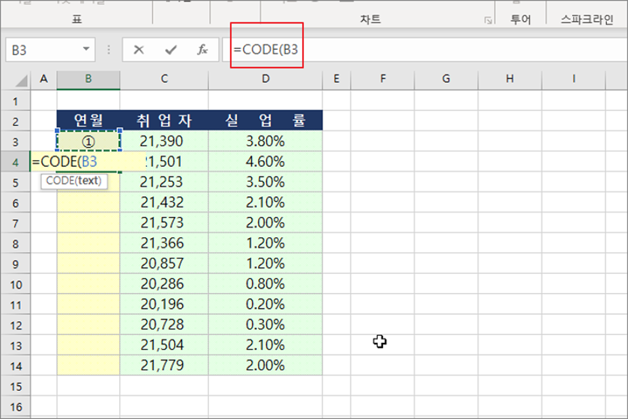 목차를 만들거나 번호를 붙이고 싶을 때 원문자를 많이 사용합니다. 이런 원문자를 특수문자 표에서 추가하지 않고 1부터 한 번에 자동으로 채울 수 있는 방법이 있습니다. 사용할 함수로는 특수문자를 숫자값으로 전환하는 CODE 와 숫자를 특수문자로 전환하는 CHAR 입니다. 단점은 1~15번 까지만 추가가 가능하다는 것입니다.