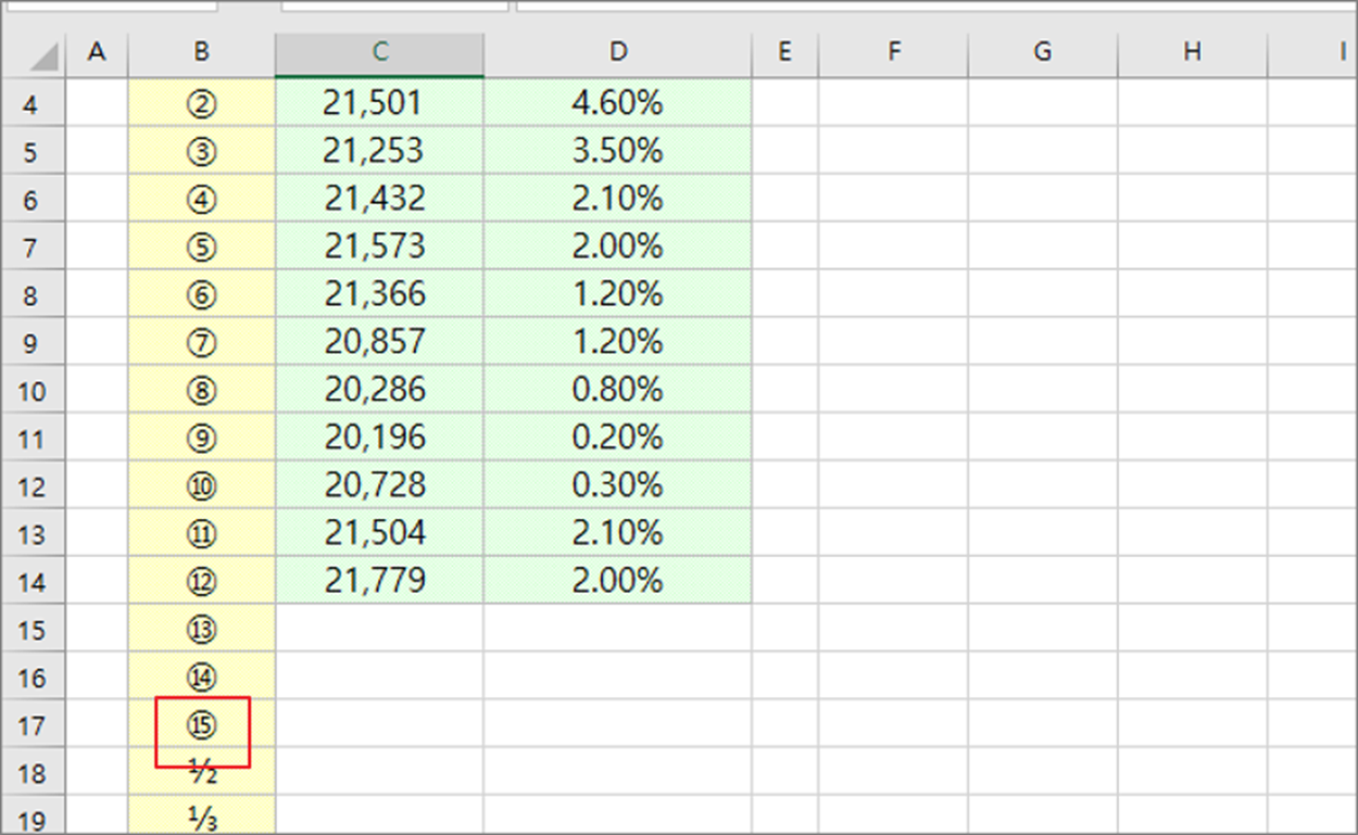 ▼ 단점이 있다면 숫자처럼 무한대로 원문자를 늘일 수는 없습니다. 할당된 원문자는 15번까지이므로 그 이상을 원하는 경우에는 사용할 수 없습니다.