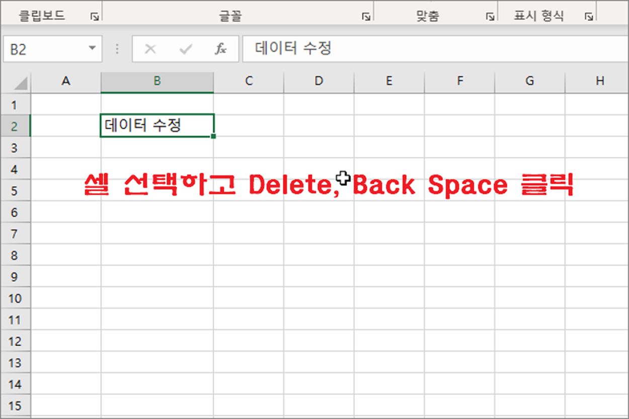 ▼ 마지막으로 셀 데이터를 삭제하는 방법입니다. 셀을 선택하고 전체 데이터를 삭제하고 싶을 때 Delete 키나 Back Space 를 클릭합니다. Back Space 는 Delete 키와 달리 데이터 삭제 후 셀 내에 커서가 위치합니다.