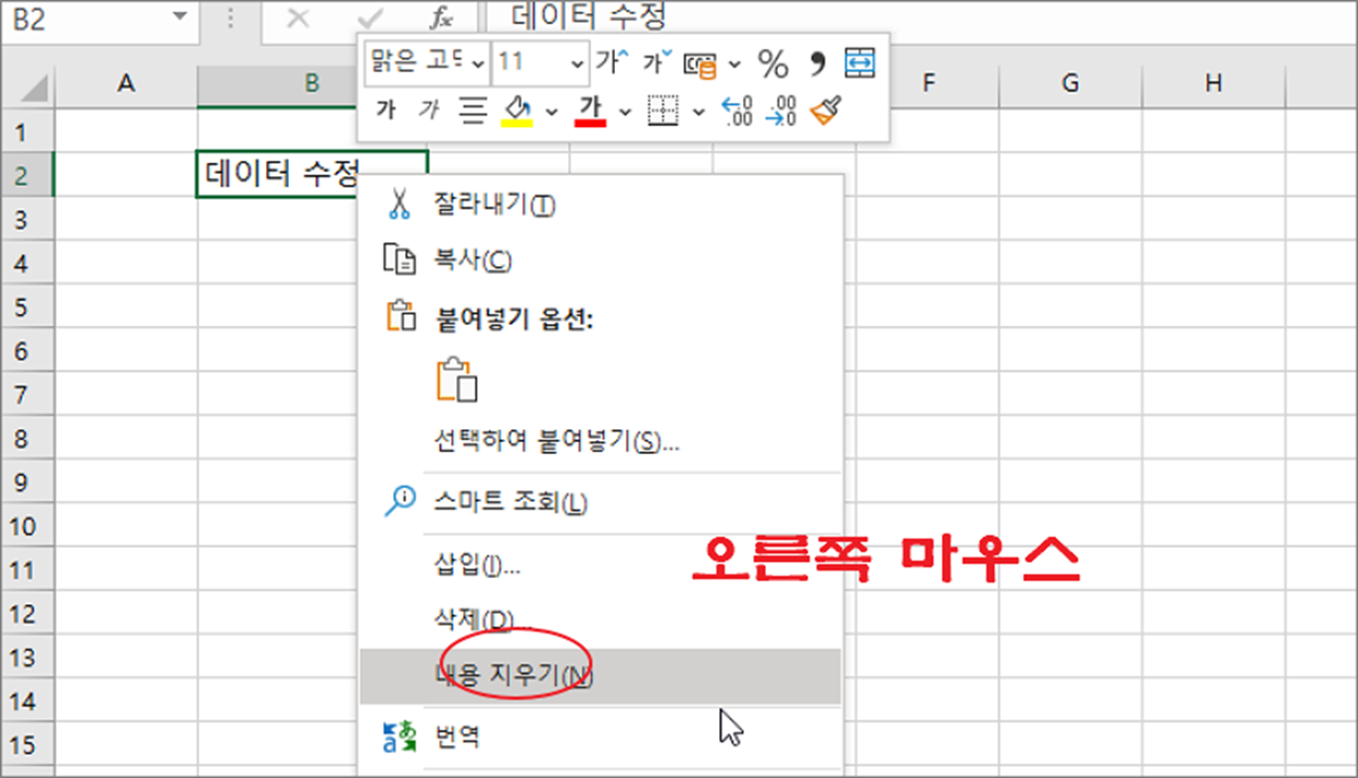 ▼ 두 번째는 삭제하고 싶은 셀을 선택하고 오른쪽 마우스 > 내용 지우기 메뉴를 선택합니다.
